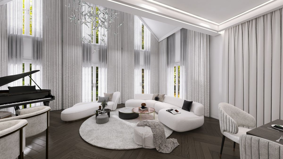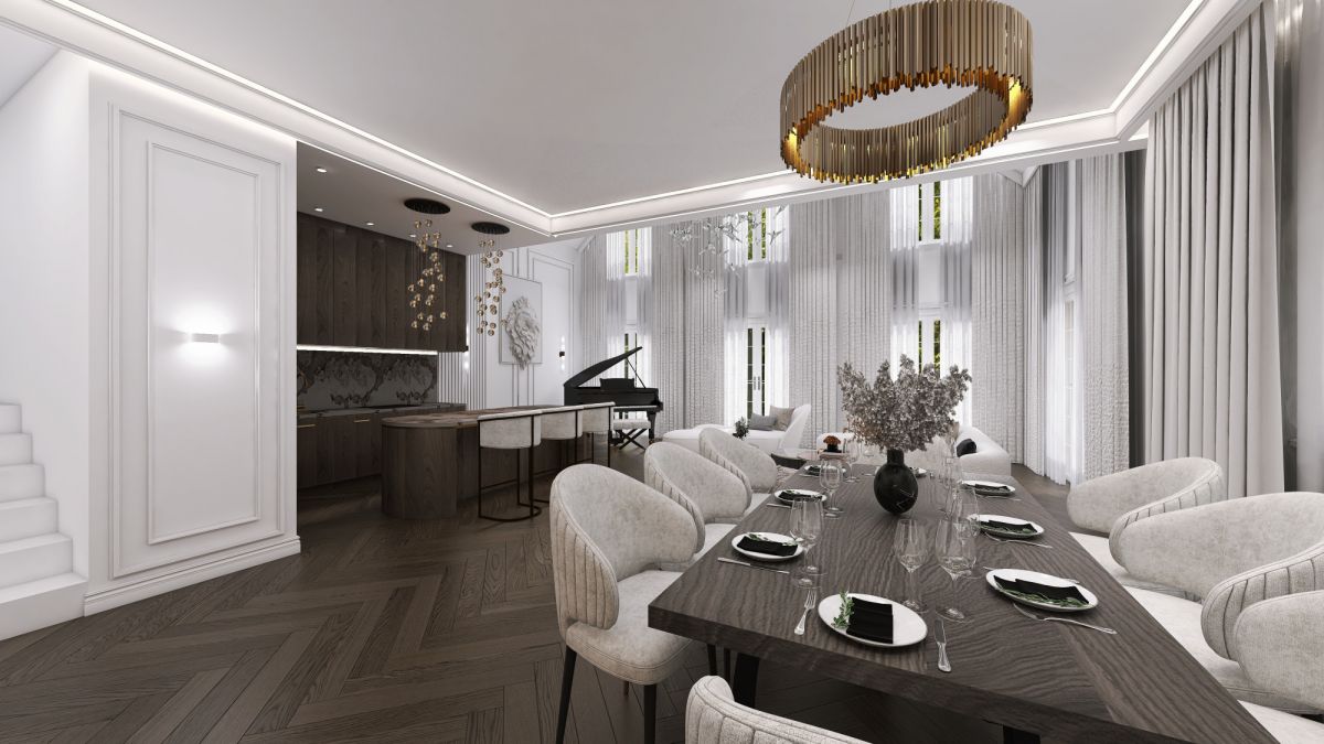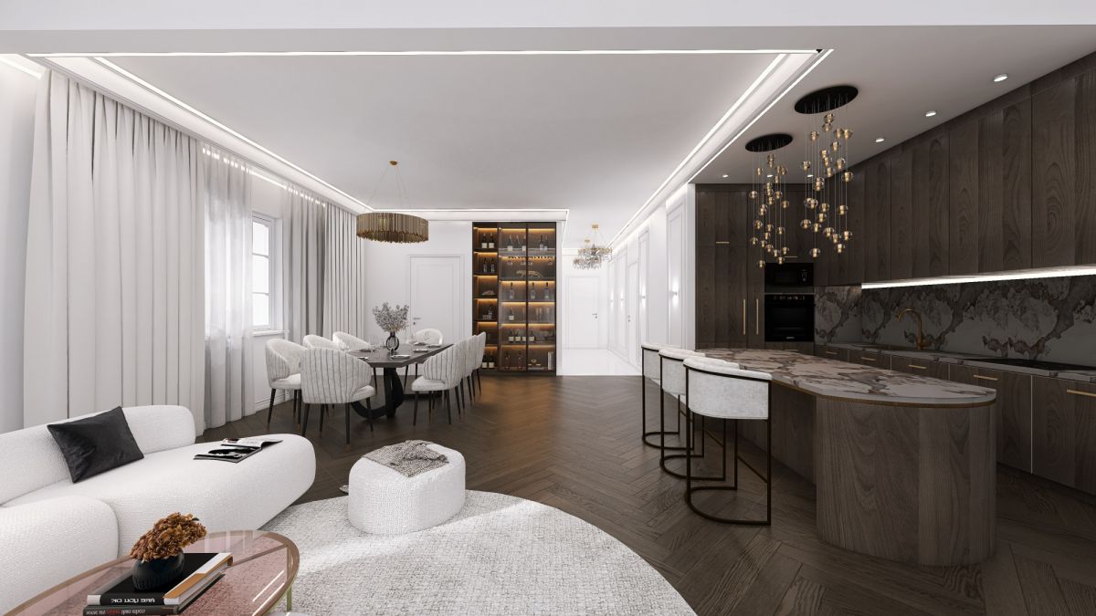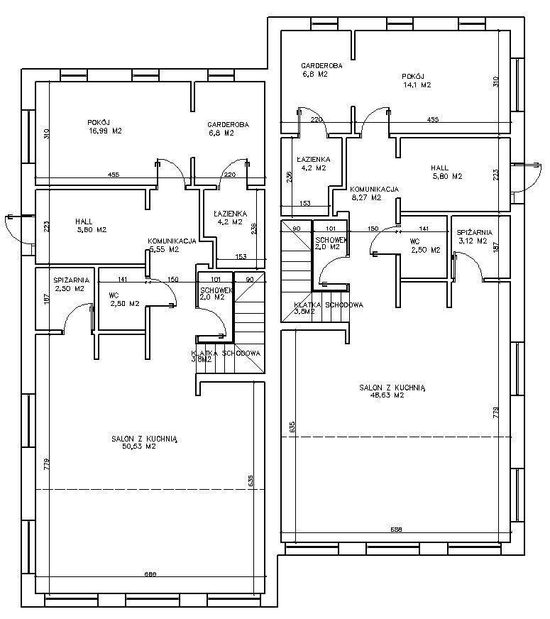 •  Salon z kuchnią 50,53 mkw. (wysokość salonu około 6,5 metra)