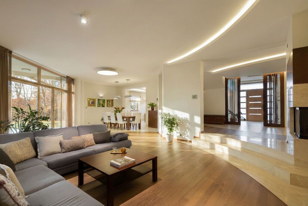 salon z jadalnią i kuchnią oraz 5 sypialni, 2 łazienki, pralnia, garderoba i garaż