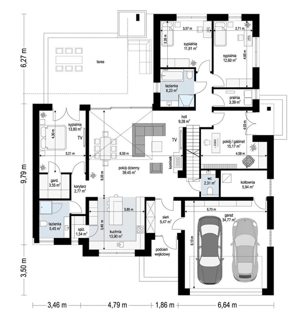 Garaż: Dwustanowiskowy, zintegrowany z bryłą budynku.
