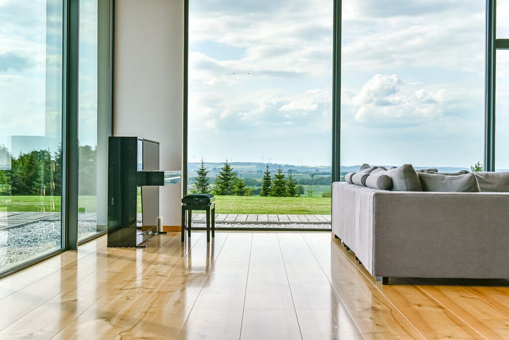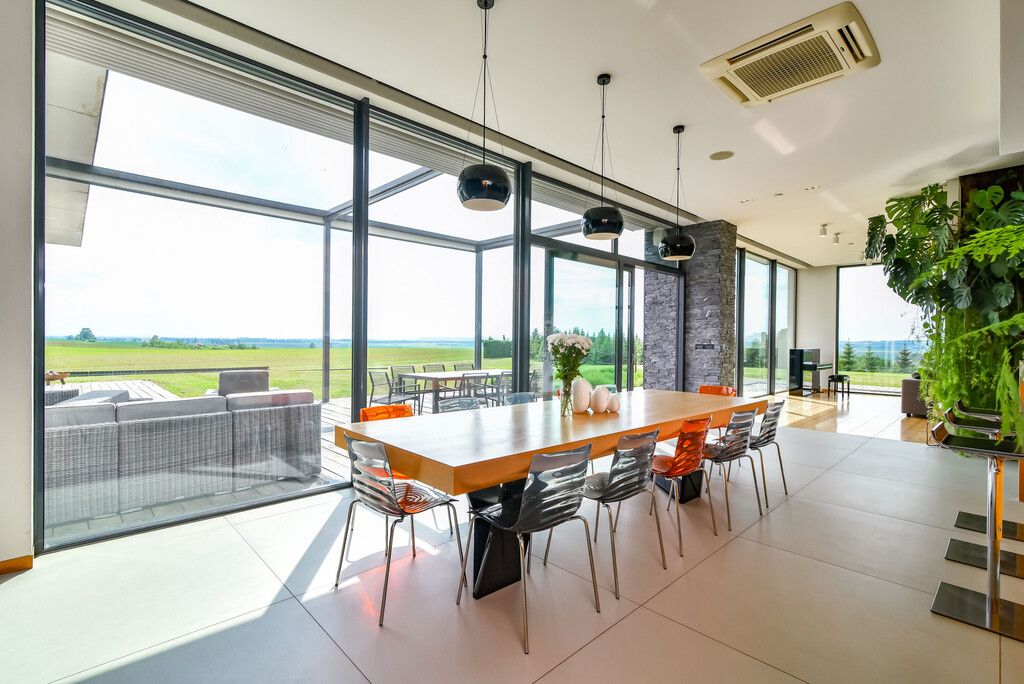 - Okna: duże, aluminiowe, z roletami i ekranami przeciwsłonecznymi