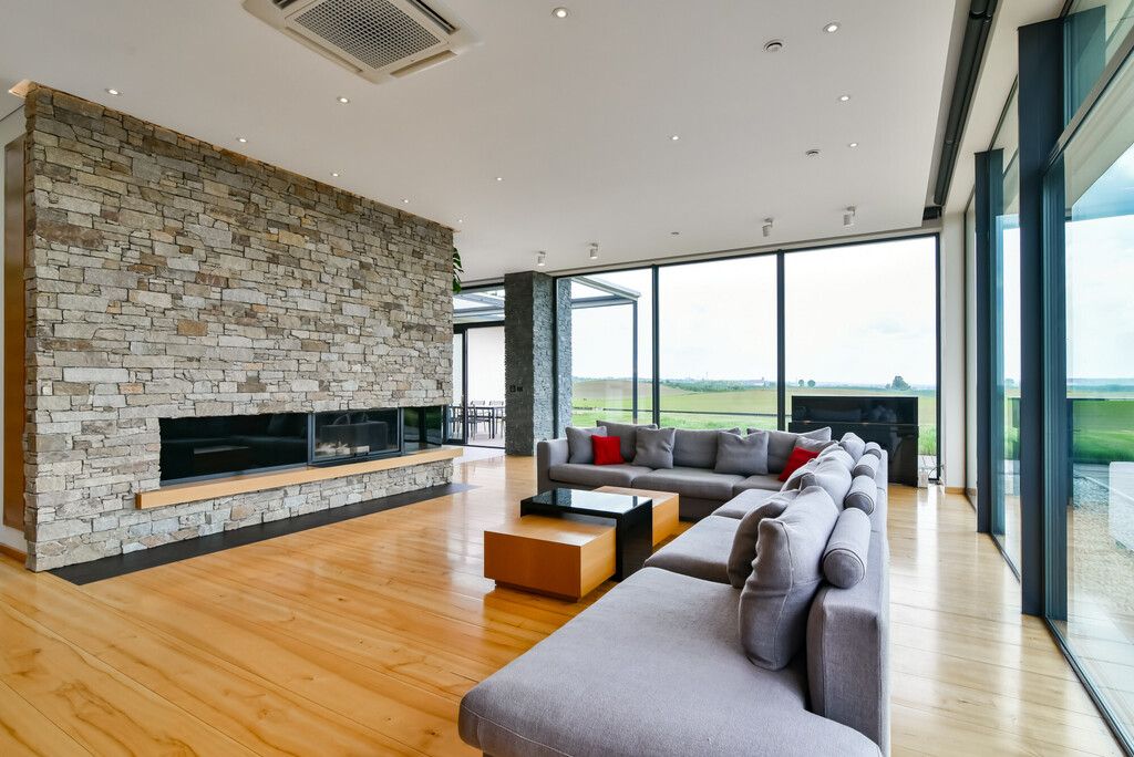Wnętrze willi to jasne, otwarte przestrzenie, panoramiczne przeszklenia oraz wysokiej jakości materiały. Układ został zaprojektowany z myślą o rodzinie i codziennym komforcie.