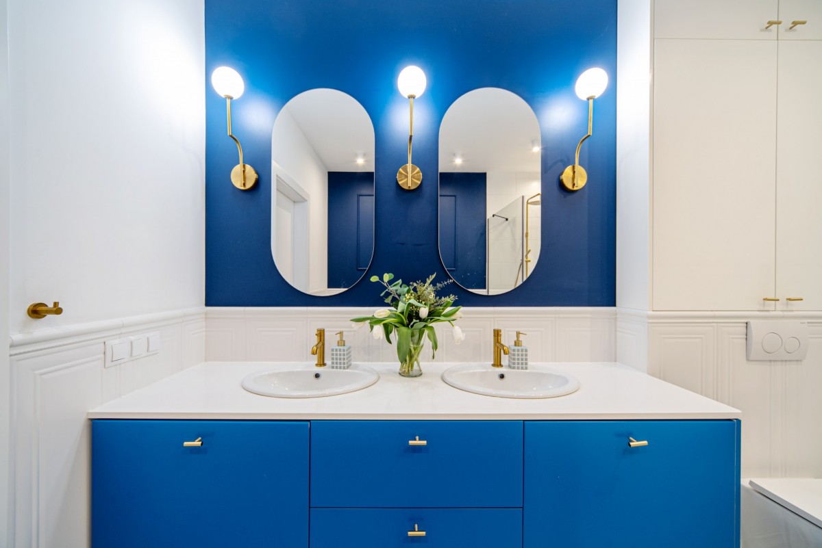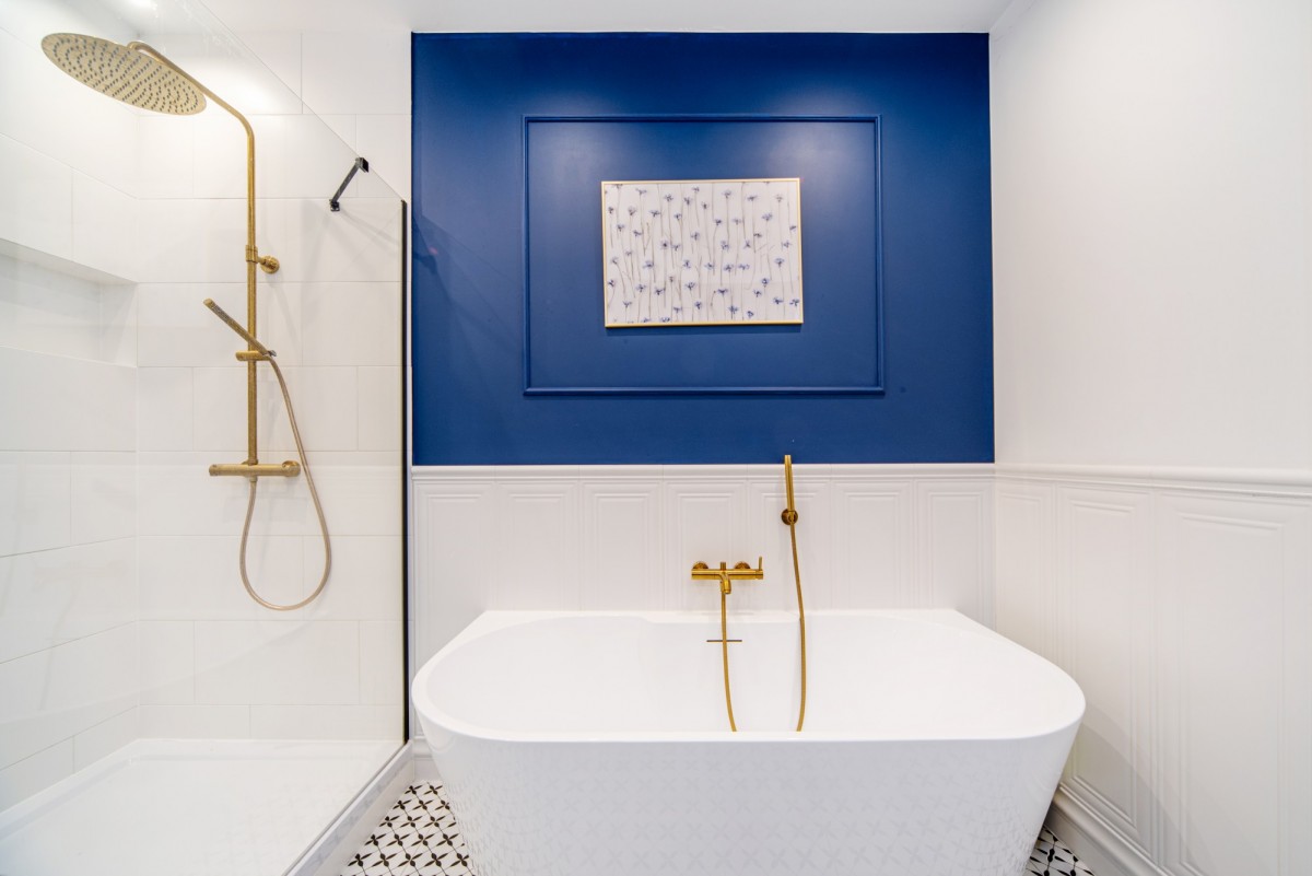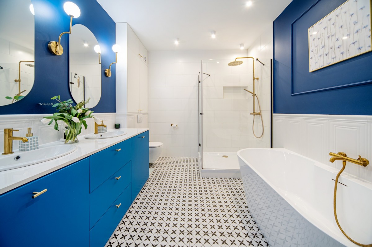 Bardzo przestronna i stylowa łazienka z wanną, prysznicem, dwoma umywalkami i ogrzewaniem podłogowym