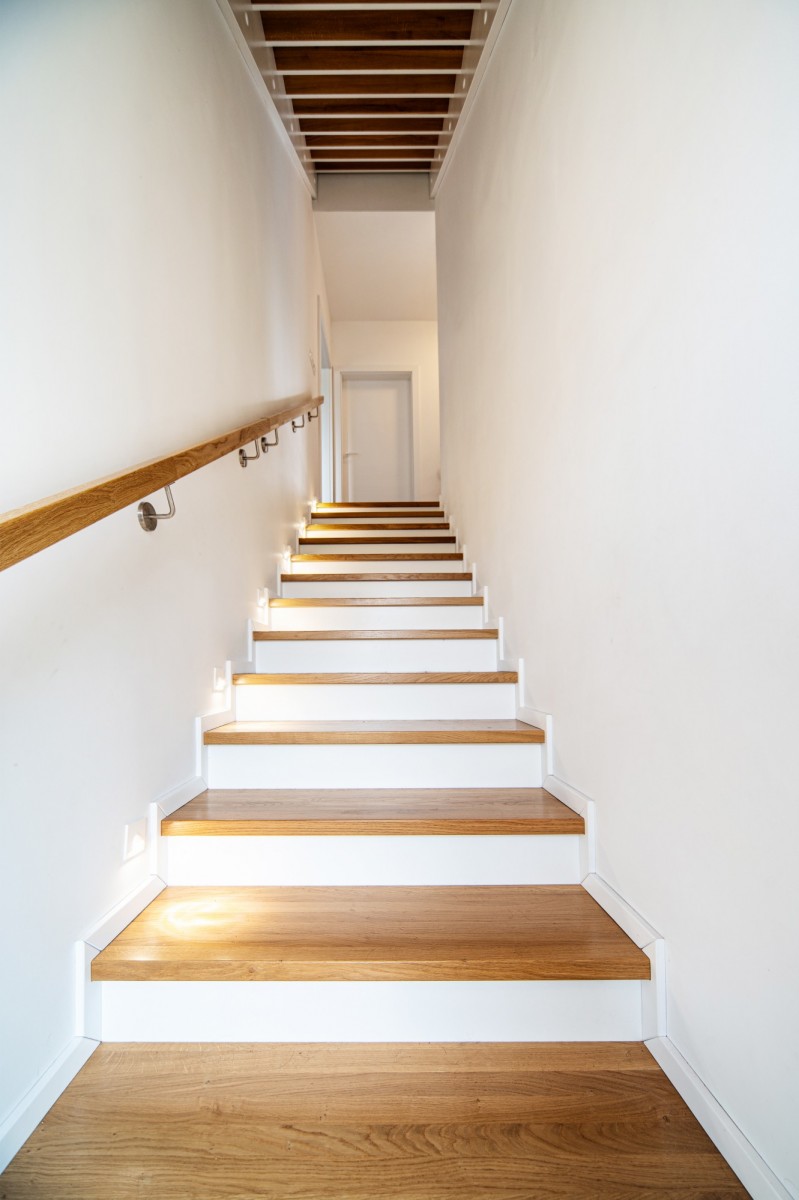 Stylowe, drewniane schody w stylu angielskim z pełną balustradą