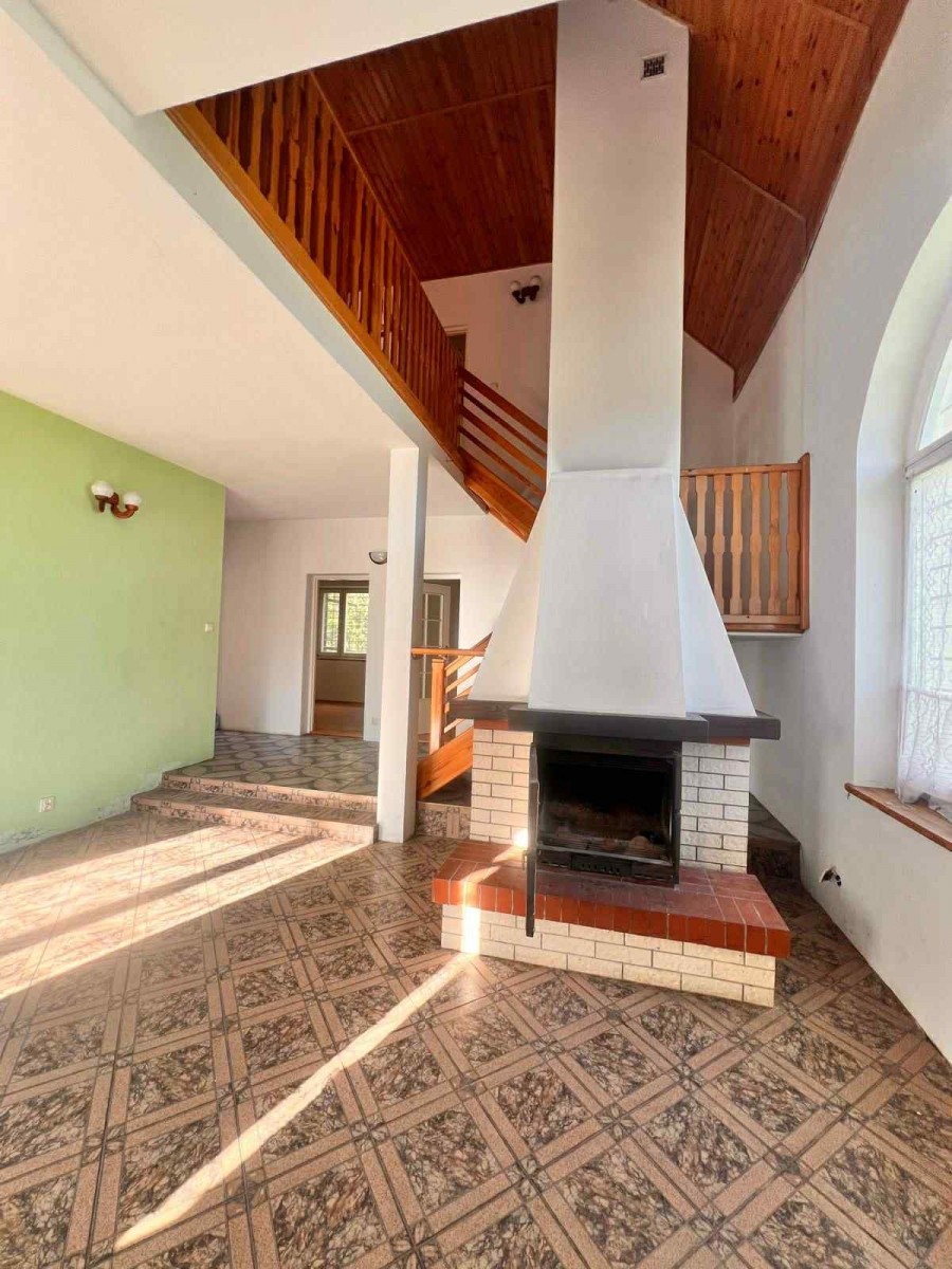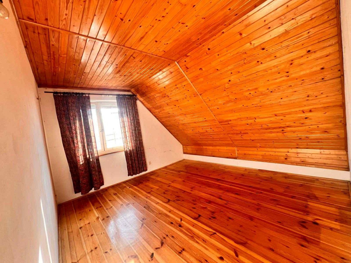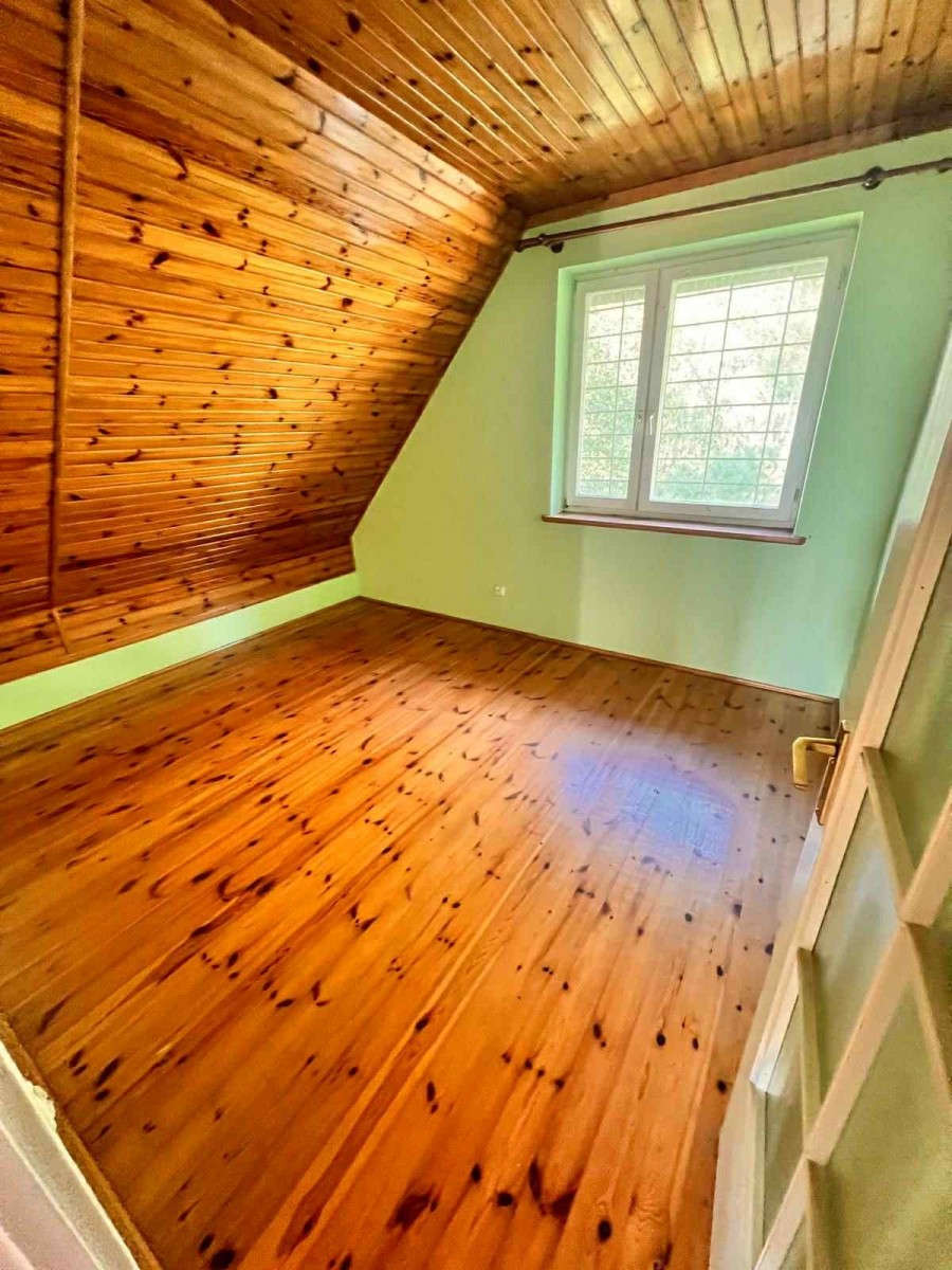 Ważnym atutem są dwie łazienki. Jedna znajduje się na dole, druga na górze. To rozwiązanie, które ułatwia życie większej rodzinie lub grupie gości. Na piętro prowadzą drewniane schody, które dodają wnętrzu ciepła i charakteru. Dodatkowo jest wejście na poddasze, które można zagospodarować według własnych potrzeb. Może stać się miejscem do przechowywania, pracownią albo dodatkową strefą wypoczynku. Stan do remontu pozwala zaplanować wszystko od podstaw, bez kompromisów narzuconych przez wcześniejsze aranżacje.