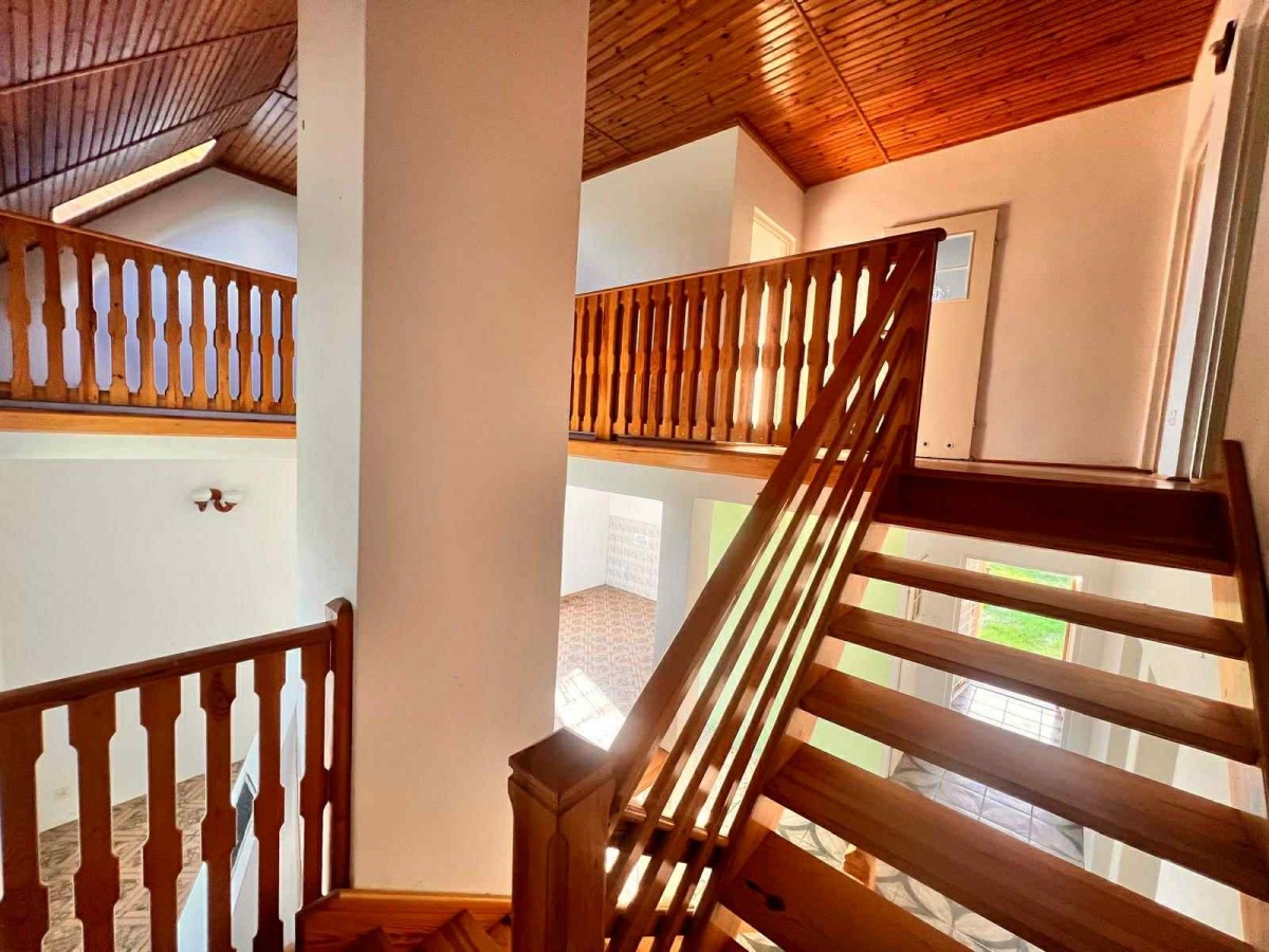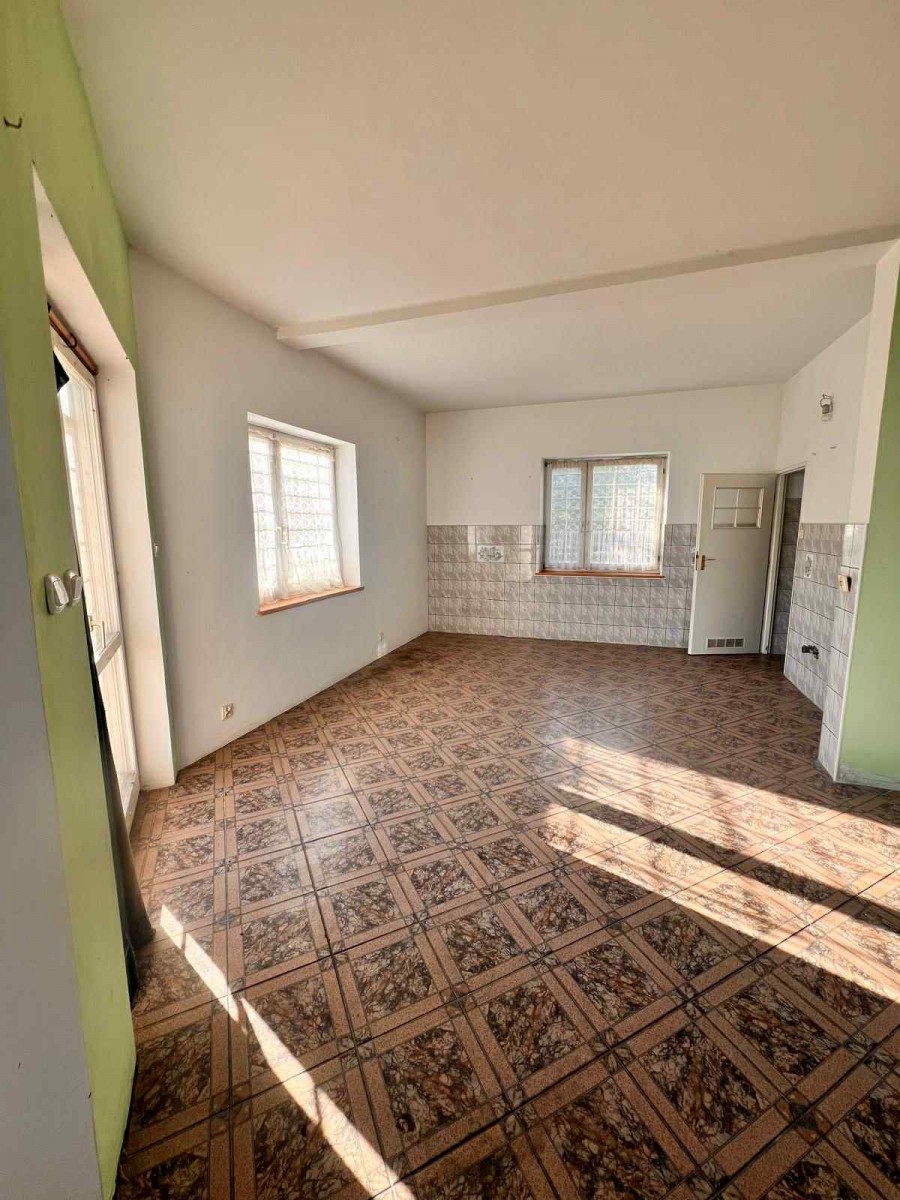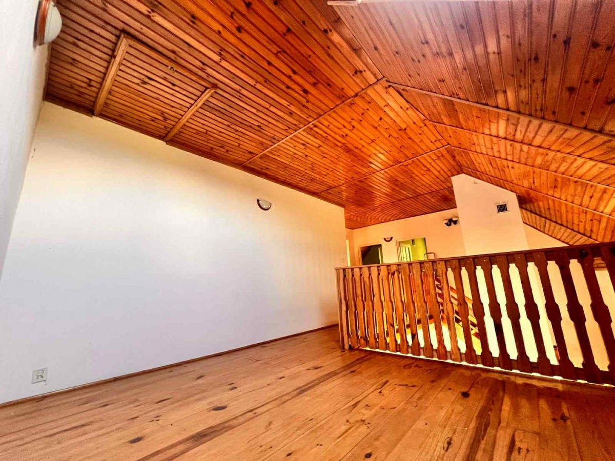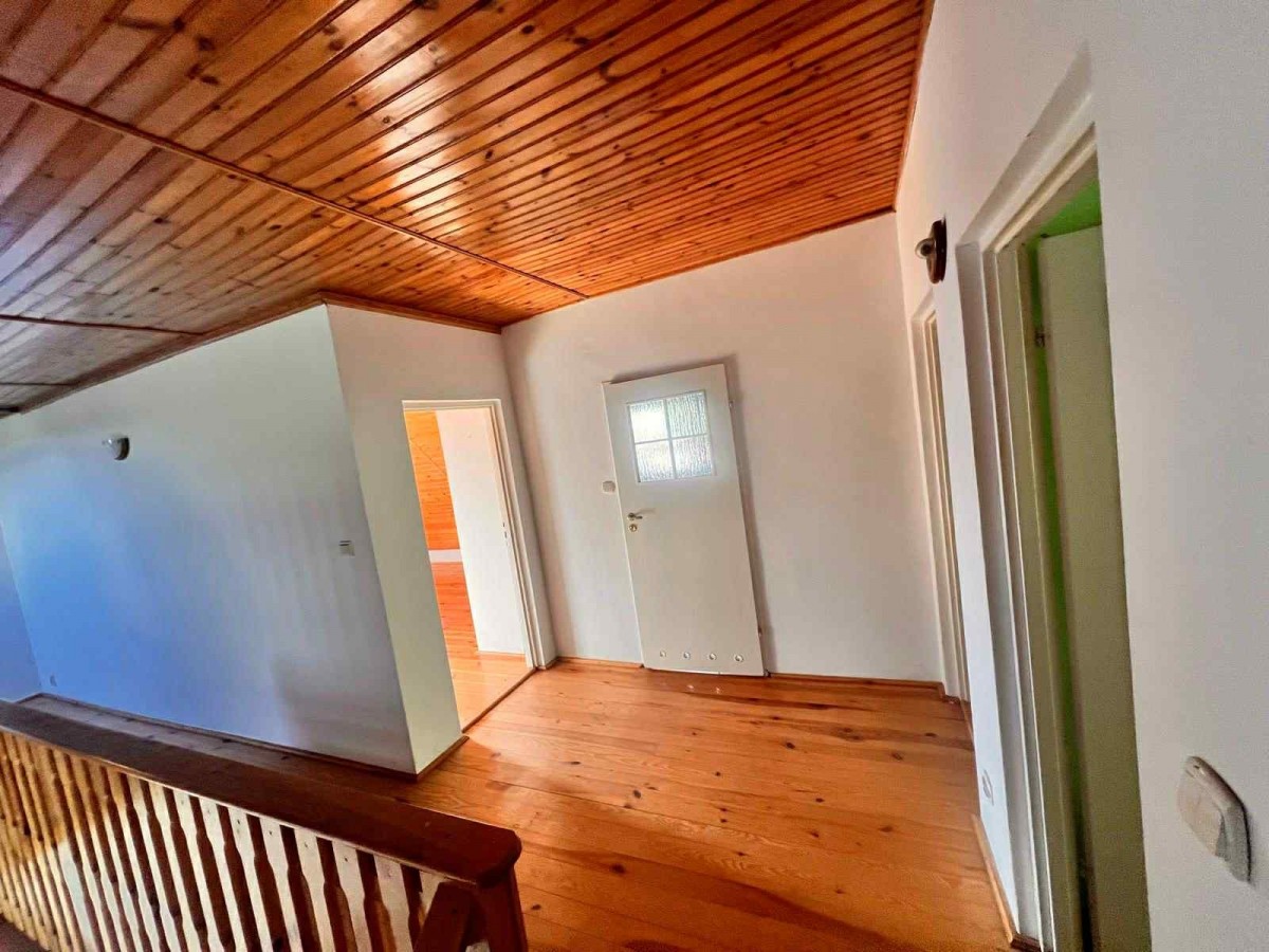 Ważnym atutem są dwie łazienki. Jedna znajduje się na dole, druga na górze. To rozwiązanie, które ułatwia życie większej rodzinie lub grupie gości. Na piętro prowadzą drewniane schody, które dodają wnętrzu ciepła i charakteru. Dodatkowo jest wejście na poddasze, które można zagospodarować według własnych potrzeb. Może stać się miejscem do przechowywania, pracownią albo dodatkową strefą wypoczynku. Stan do remontu pozwala zaplanować wszystko od podstaw, bez kompromisów narzuconych przez wcześniejsze aranżacje.