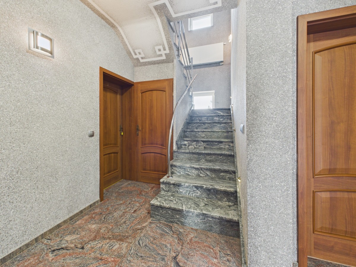 Wysoki standard wykończenia: Starannie dobrane materiały, granitowe schody, eleganckie tynki dekoracyjne oraz drewniane elementy w jadalni nadają wnętrzom prestiżowy charakter.