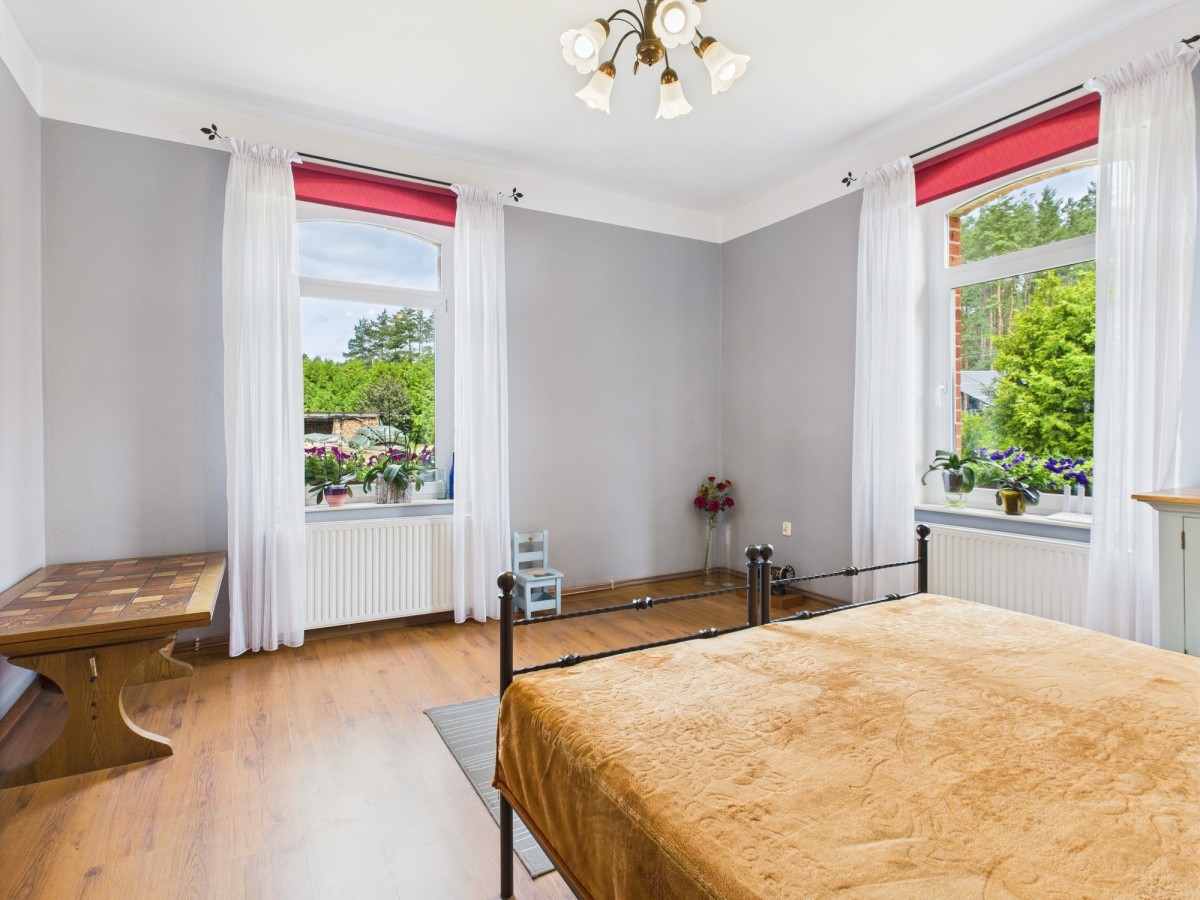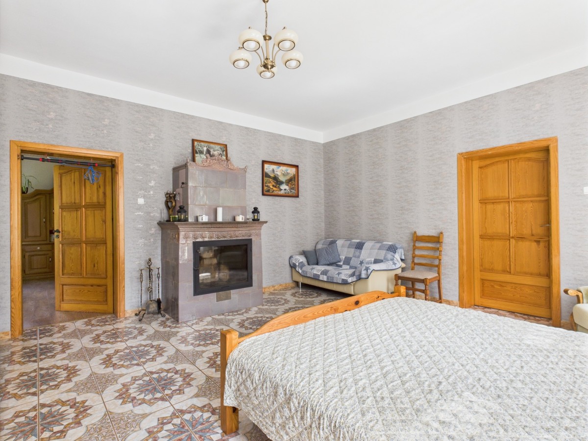 Okna PCV, drewniane drzwi wewnętrzne, kominek w sypialni - elementy dodające ciepła i klimatu.