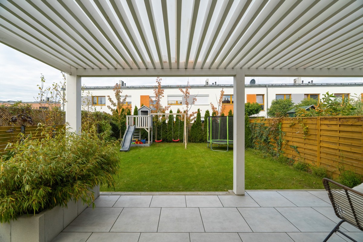 Ogród zaaranżowany, obsadzony tujami i ozdobnymi krzewami, z tarasem oraz domkiem dla dzieci.