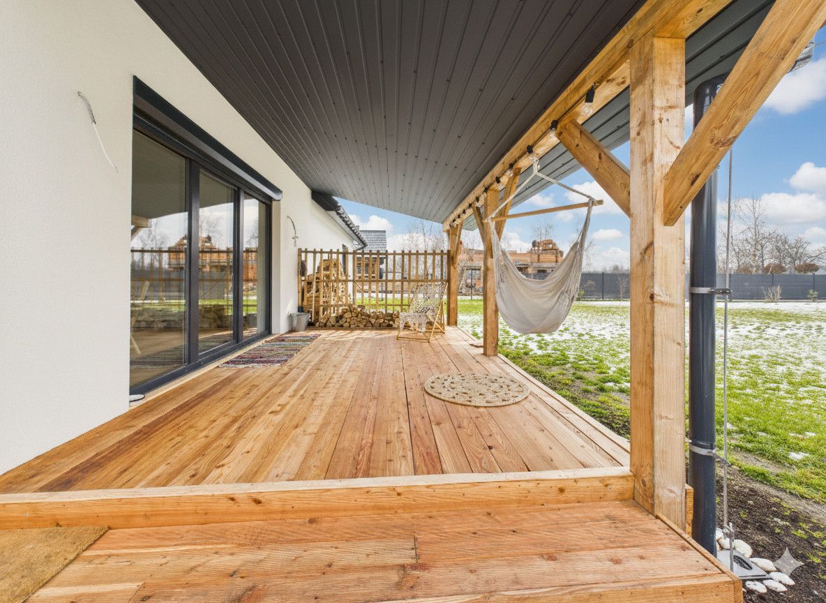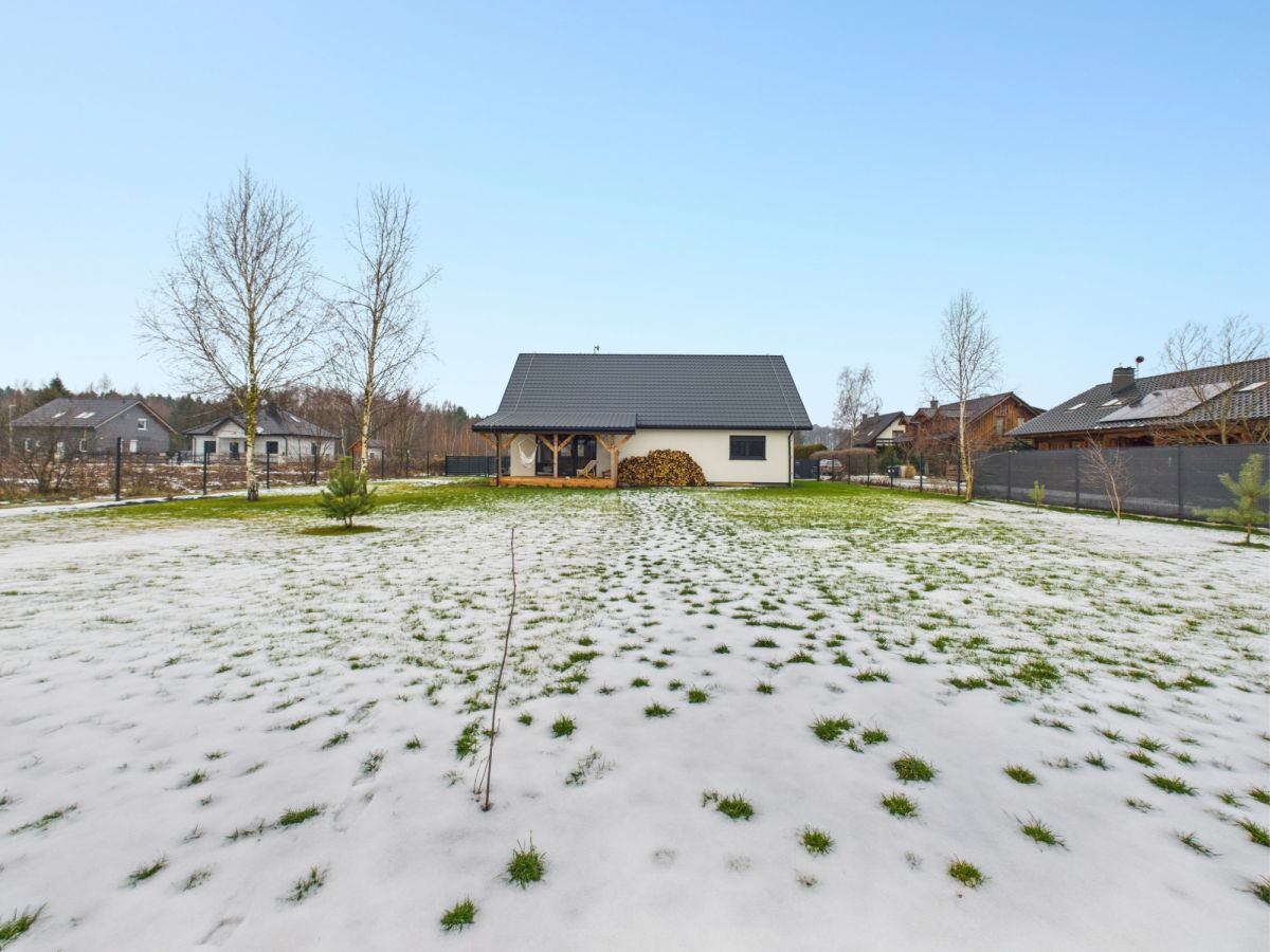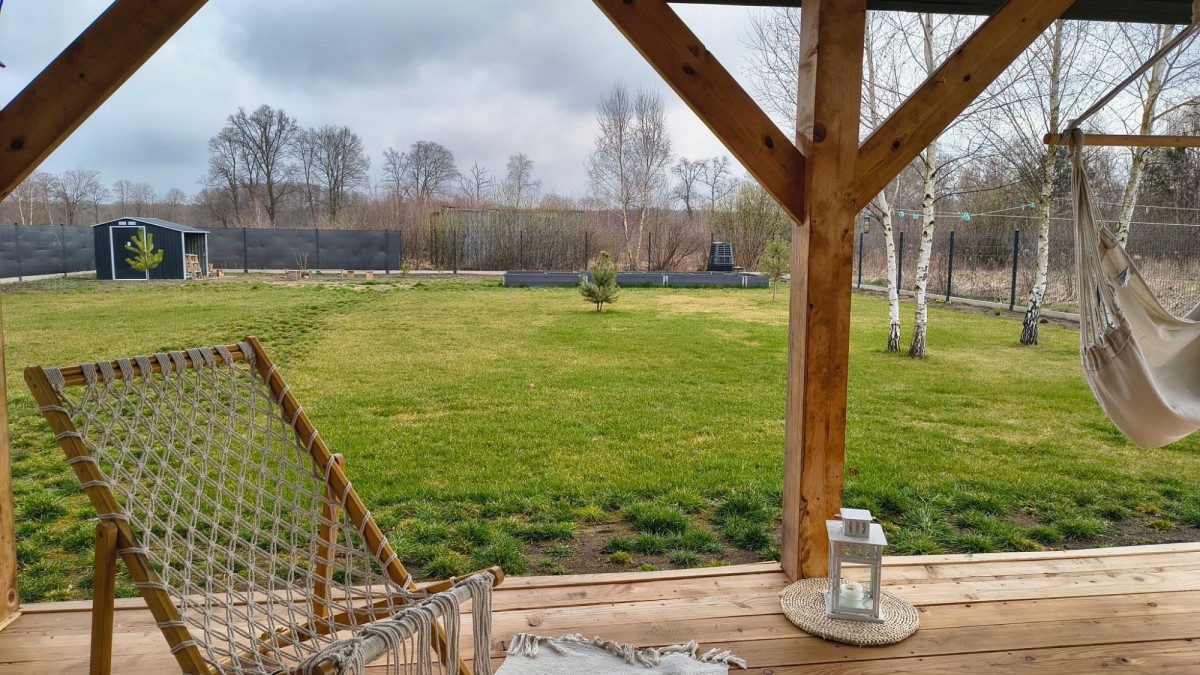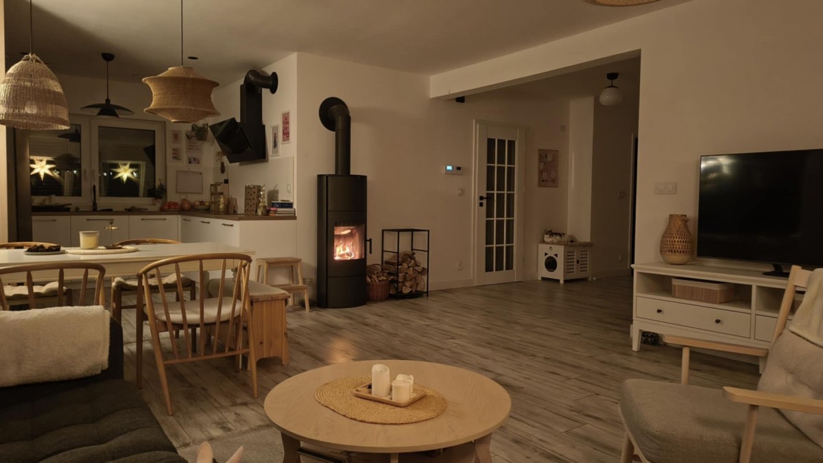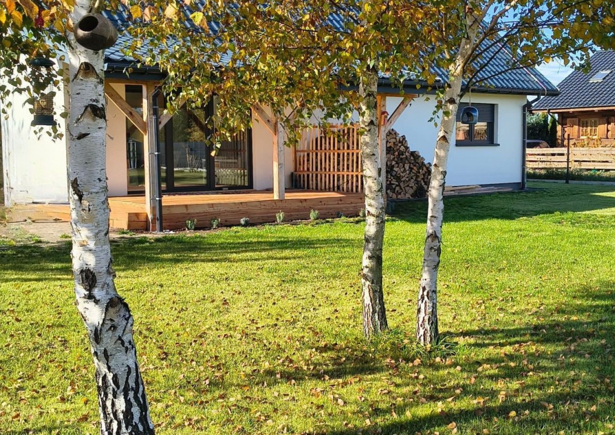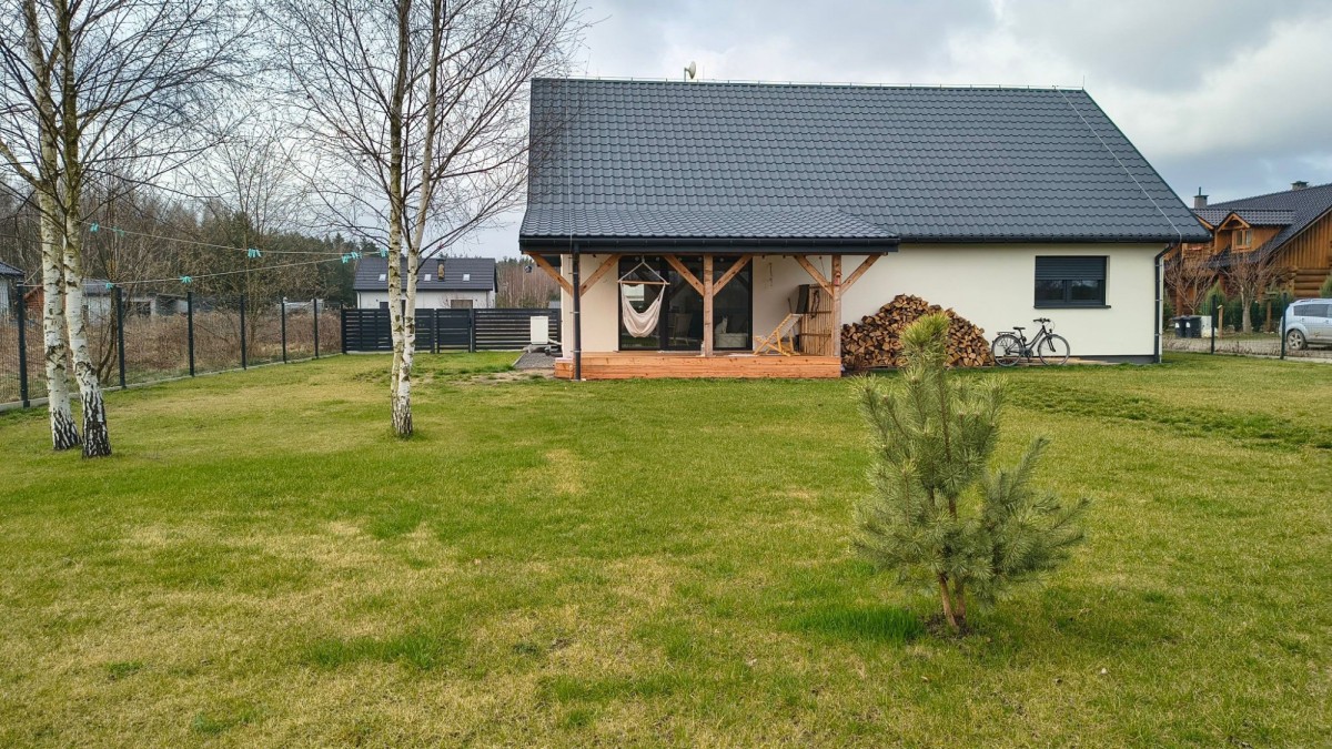 Komfort: Kominek w salonie (+ zapas drewna na 2 sezony), zadaszony taras 15 m².