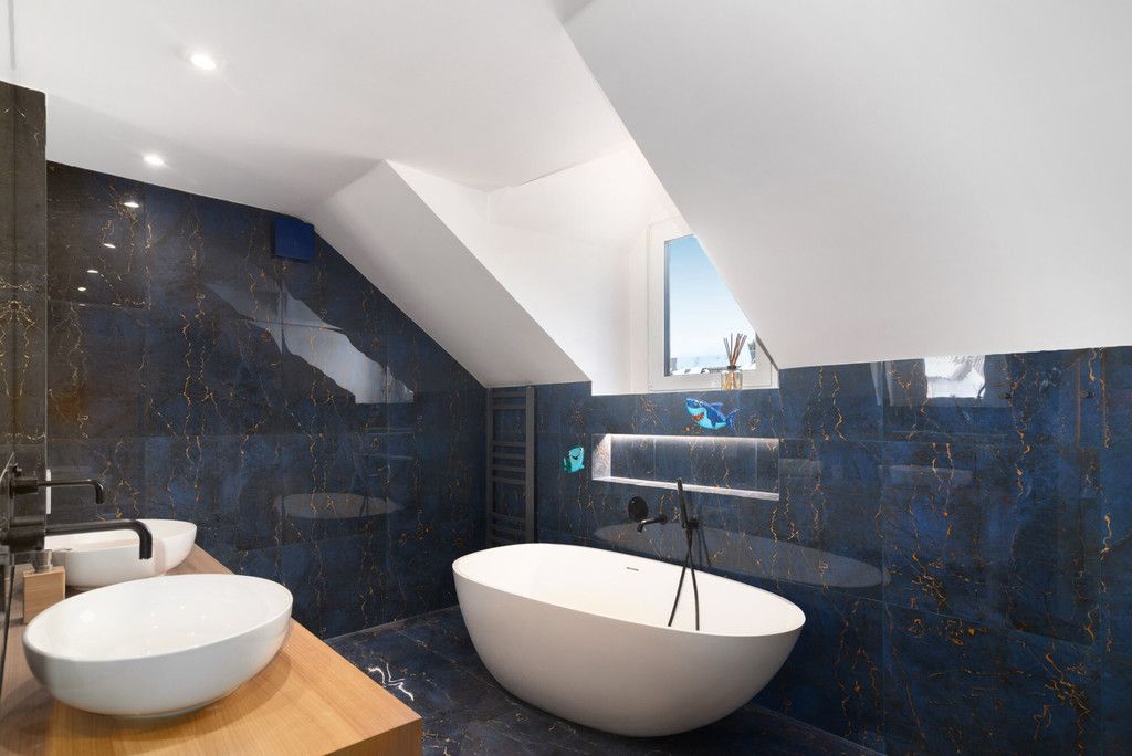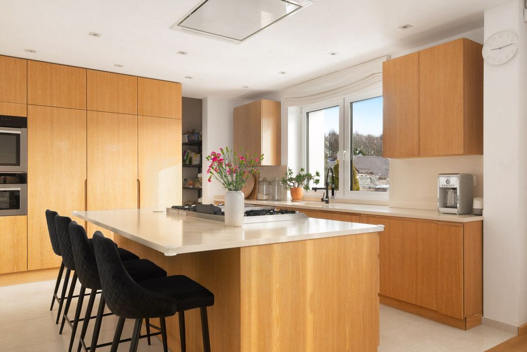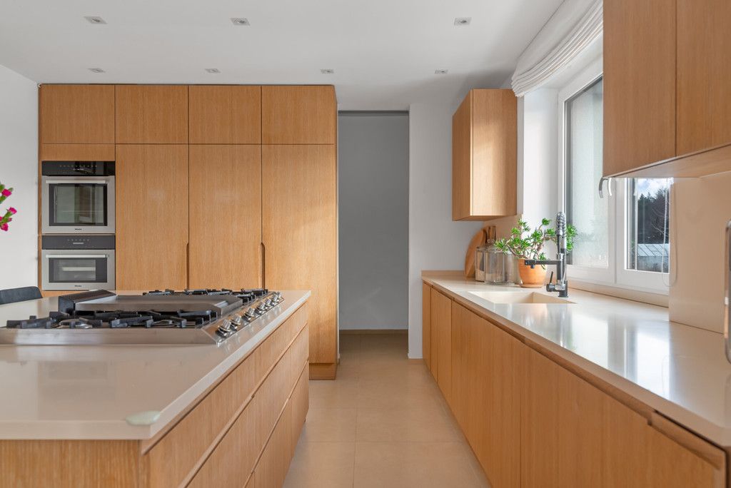 (płyta gazowa z 6 palnikami płyta typu smash, piekarnik Miele piekarnik parowy Miele ze zdalnym sterowaniem, dwie pełnowymiarowe lodówki Liebherr zamrażarka, dwie duże zmywarki Miele, kamienny zlew i marmurowe blaty, drewniane meble kuchenne na zamówienie, okap ukryty w suficie, ukryta spiżarnia.