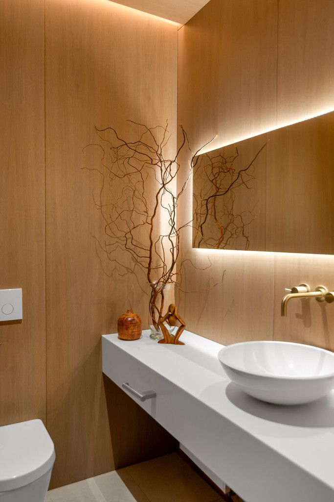 Dalej toaleta dla gości i schody w kształcie spirali dodają wnętrzu charakteru - z zewnątrz dom sprawia wrażenie posiadania własnej baszty. Schody mają przygotowanie pod LED-y w poręczy, czujniki ruchu i zmierzchu oraz elegancką tapetę o fakturze płóciennego worka.