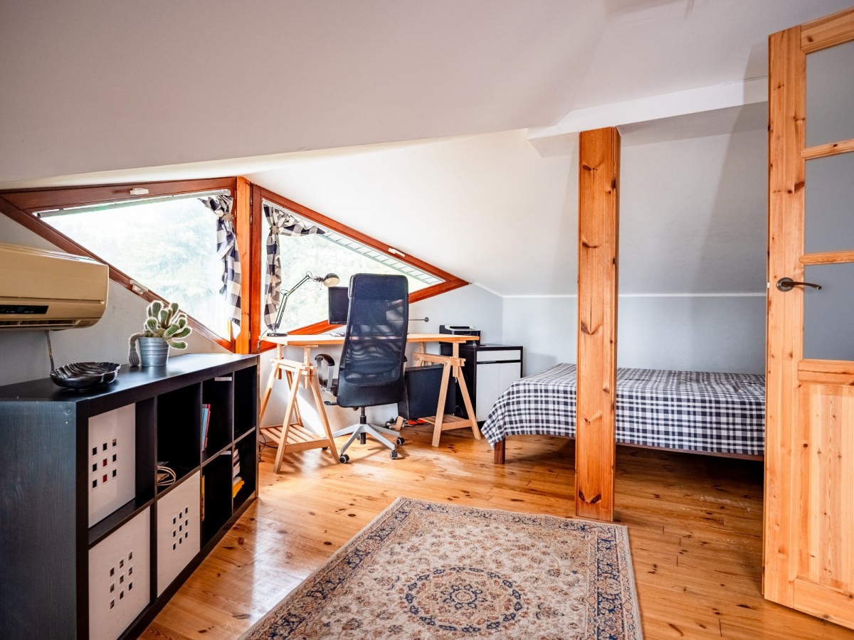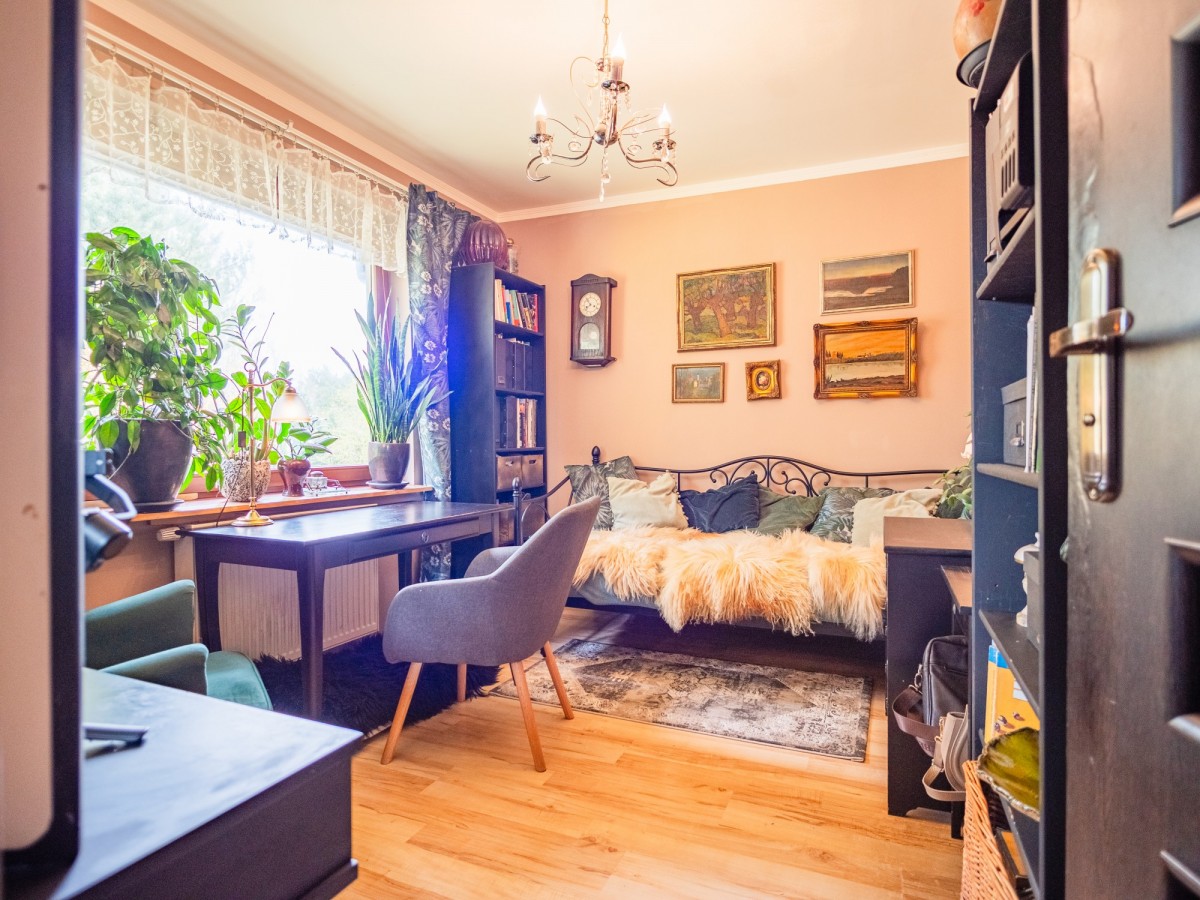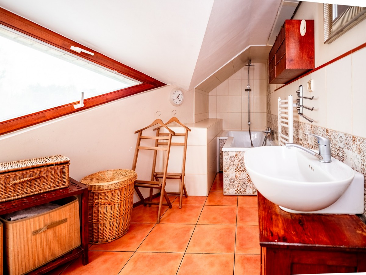 Poddasze zostało w pełni zaadaptowane i stanowi dodatkową, bardzo funkcjonalną przestrzeń. Znajduje się tu duży pokój z klimatyzacją (30,38 m² liczone po podłodze), który świetnie sprawdzi się jako strefa relaksu, pracownia lub sypialnia. Do dyspozycji jest także druga łazienka (10,06 m² po podłodze) oraz garderoba.