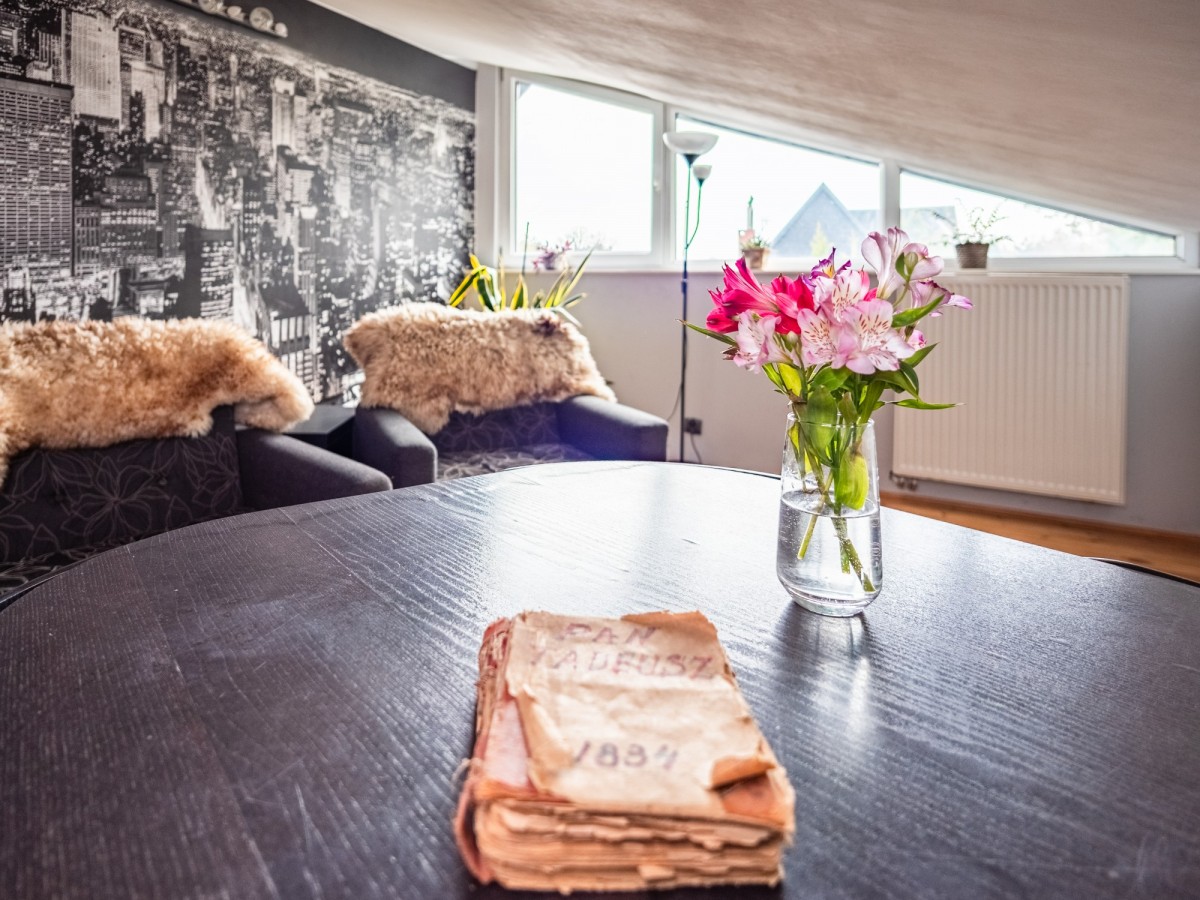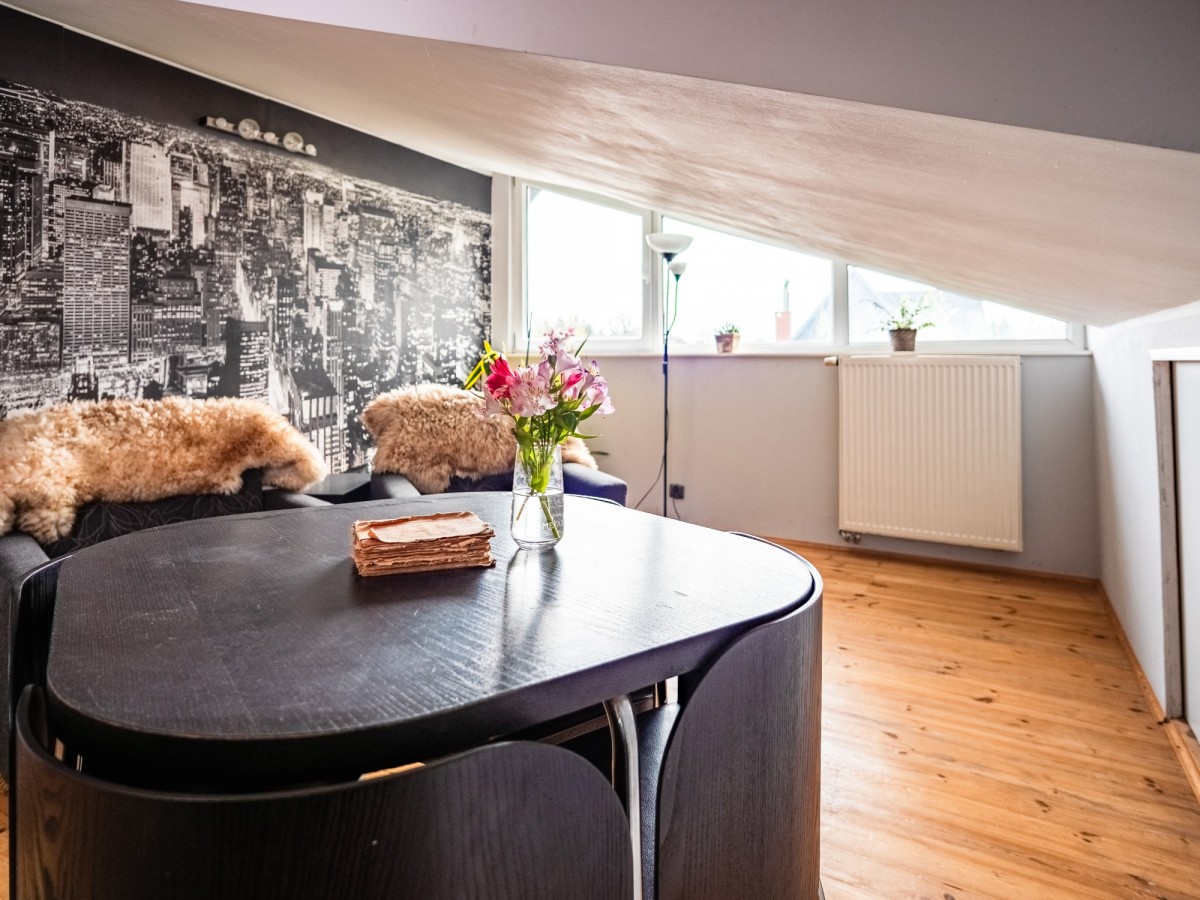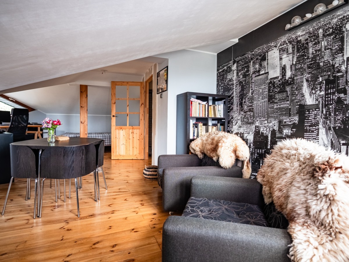 Poddasze zostało w pełni zaadaptowane i stanowi dodatkową, bardzo funkcjonalną przestrzeń. Znajduje się tu duży pokój z klimatyzacją (30,38 m² liczone po podłodze), który świetnie sprawdzi się jako strefa relaksu, pracownia lub sypialnia. Do dyspozycji jest także druga łazienka (10,06 m² po podłodze) oraz garderoba.
