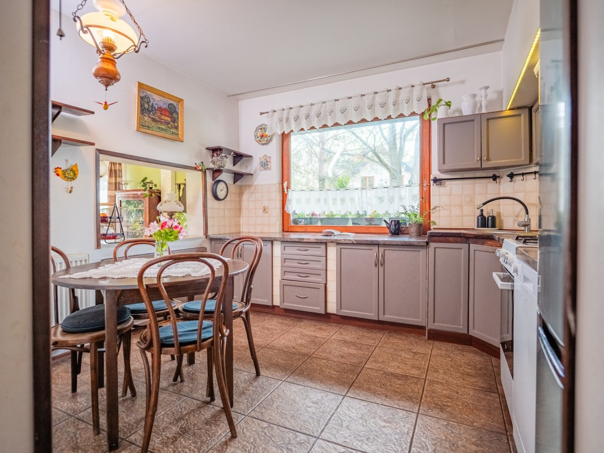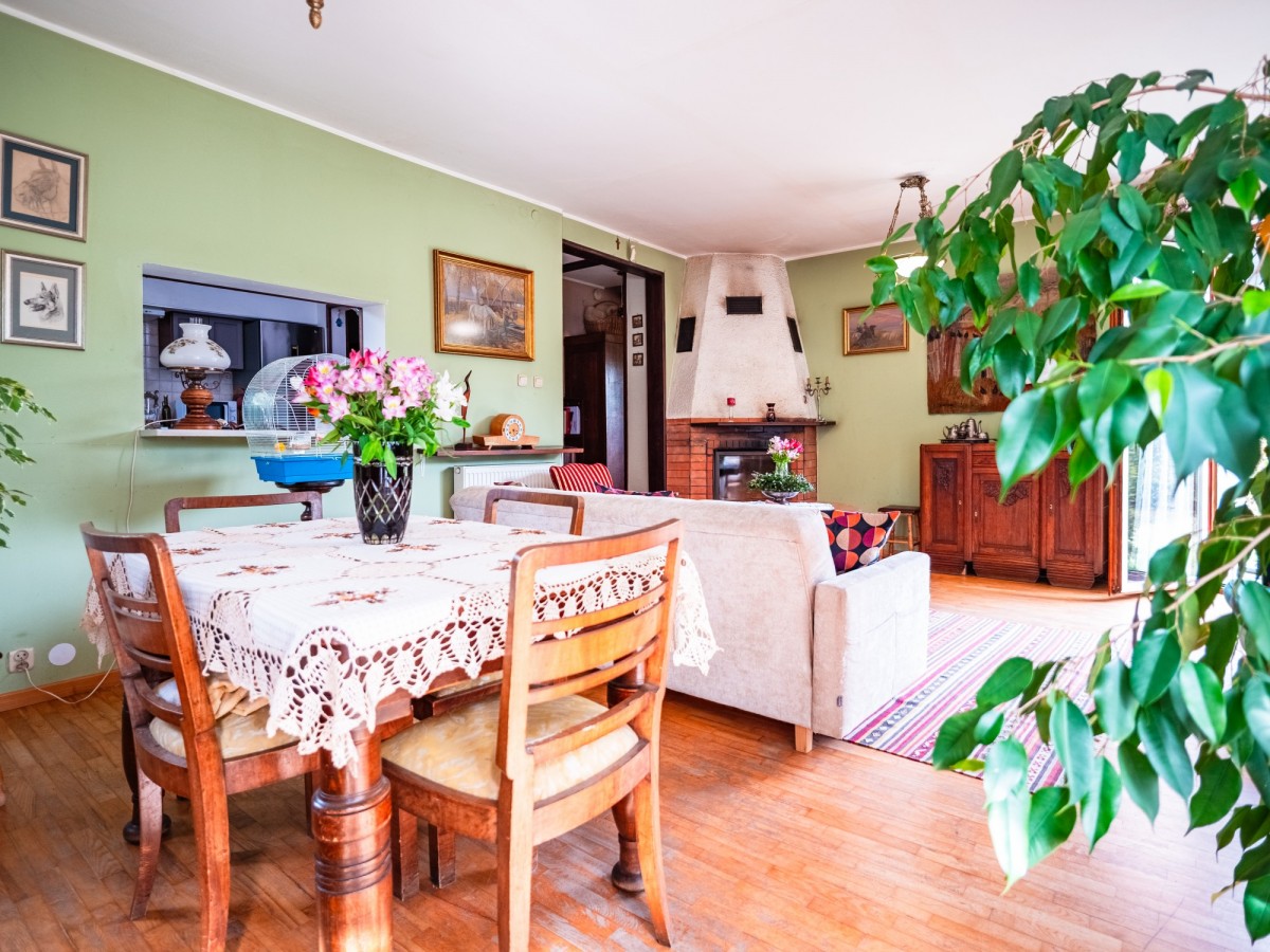 Już od wejścia uwagę przyciąga funkcjonalny układ pomieszczeń. Sercem domu jest przestronny salon o powierzchni 35 m² z kominkiem, który tworzy ciepłą, rodzinną atmosferę, oraz bezpośrednim wyjściem na ogród idealnym na letnie wieczory i spotkania z bliskimi. Obok znajduje się ustawna kuchnia (10,51 m²), która daje duże możliwości aranżacyjne.