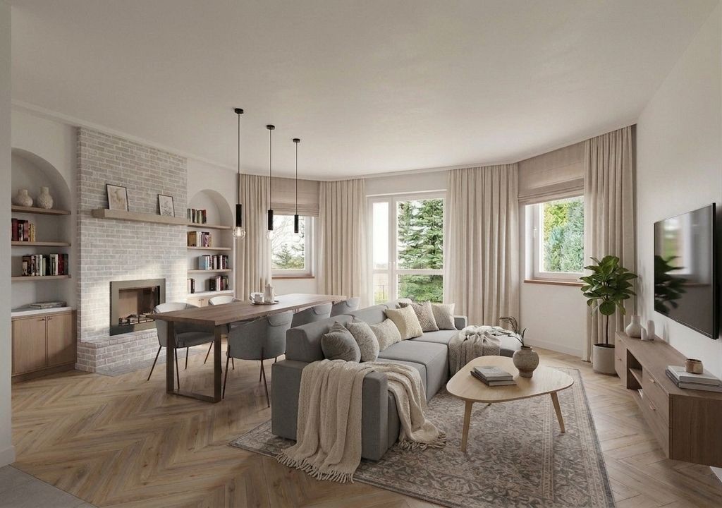 - The spacious living room, with a fireplace and large windows that provide natural light and views of the surrounding greenery, is designed to be the heart of the home – a place to meet, relax, and spend time together.