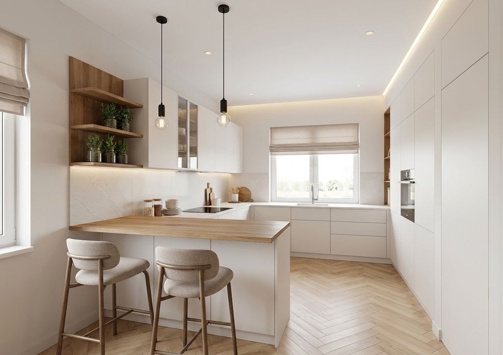 - A functional kitchen with the option of an island or breakfast counter. The design includes full built-in furniture, ergonomic appliance layout, and convenient access to the dining area.