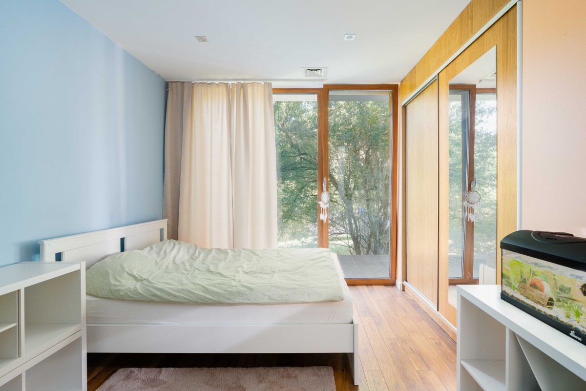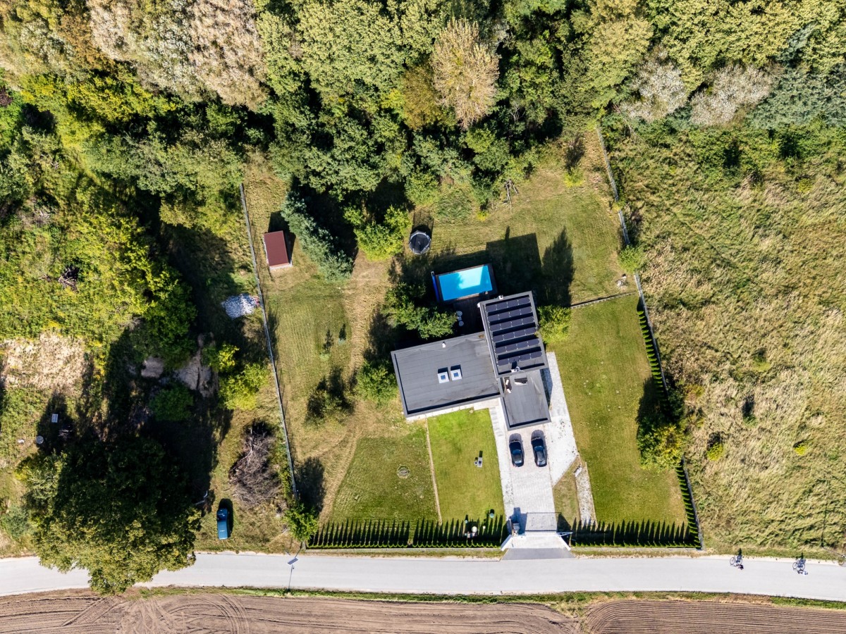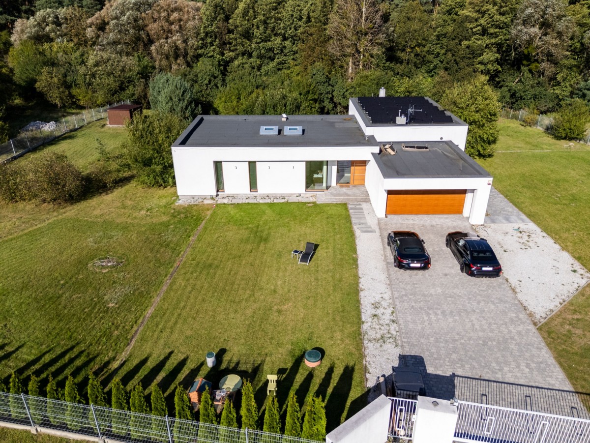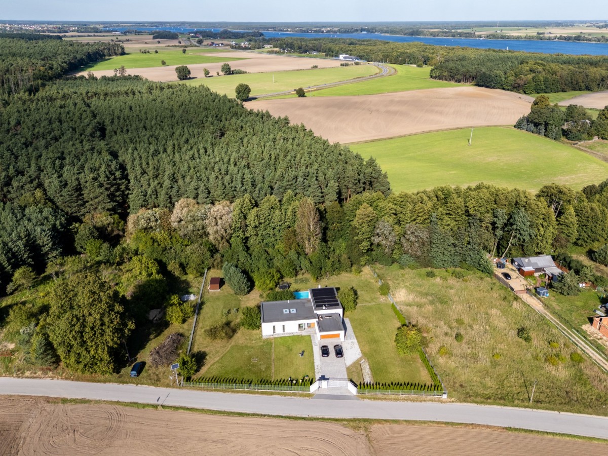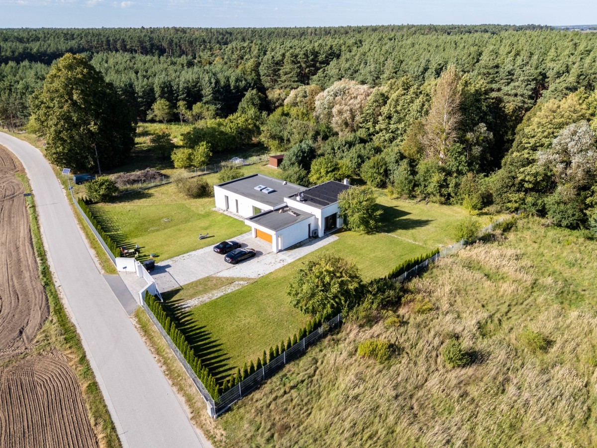 Na sprzedaż wyjątkowa nieruchomość - parterowy dom całoroczny z płaskim dachem, położony na dużej, zagospodarowanej działce o powierzchni 4800 m², tuż przy ścianie lasu.