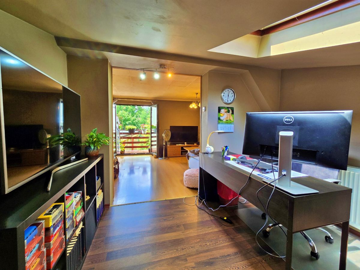 II piętro 65m2 (poddasze): 3 pokoje (jeden z balkonem), kuchnia z oknem, otwarta na salon, łazienka