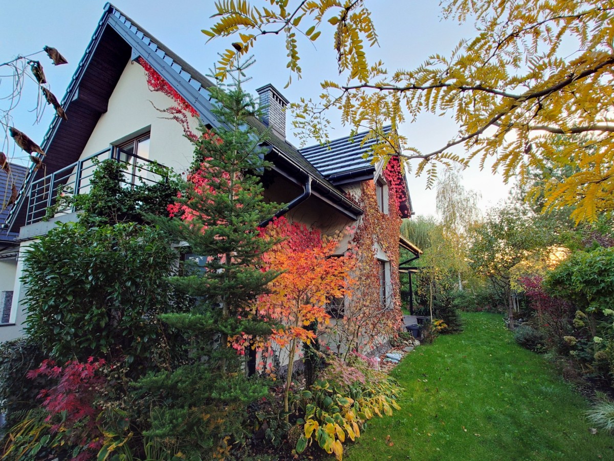 Na pięcioarowej działce jest pięknie zaranżowany ogród z ciekawymi nasadzeniami i sporo miejsca na relaks na trawie, czy tarasie. Przez furtkę w ogrodzeniu można wyjść nad Sudół, który płynie tuż za działką. Cały teren tego mini-osiedla jest monitorowany i ogrodzony. Wjazd bramą na pilota.