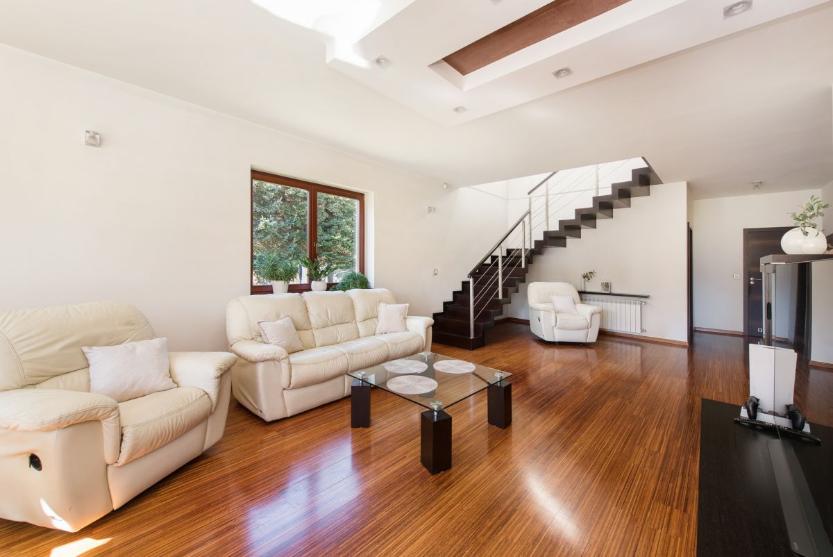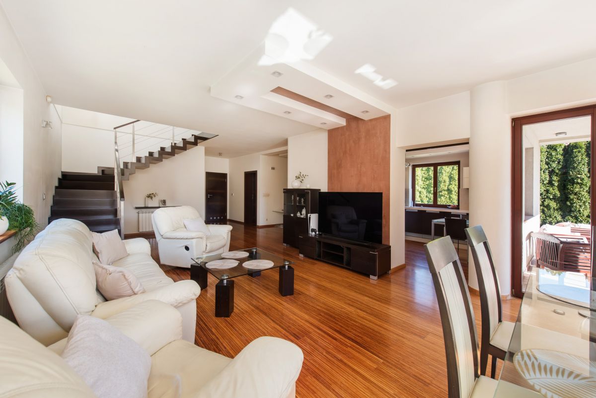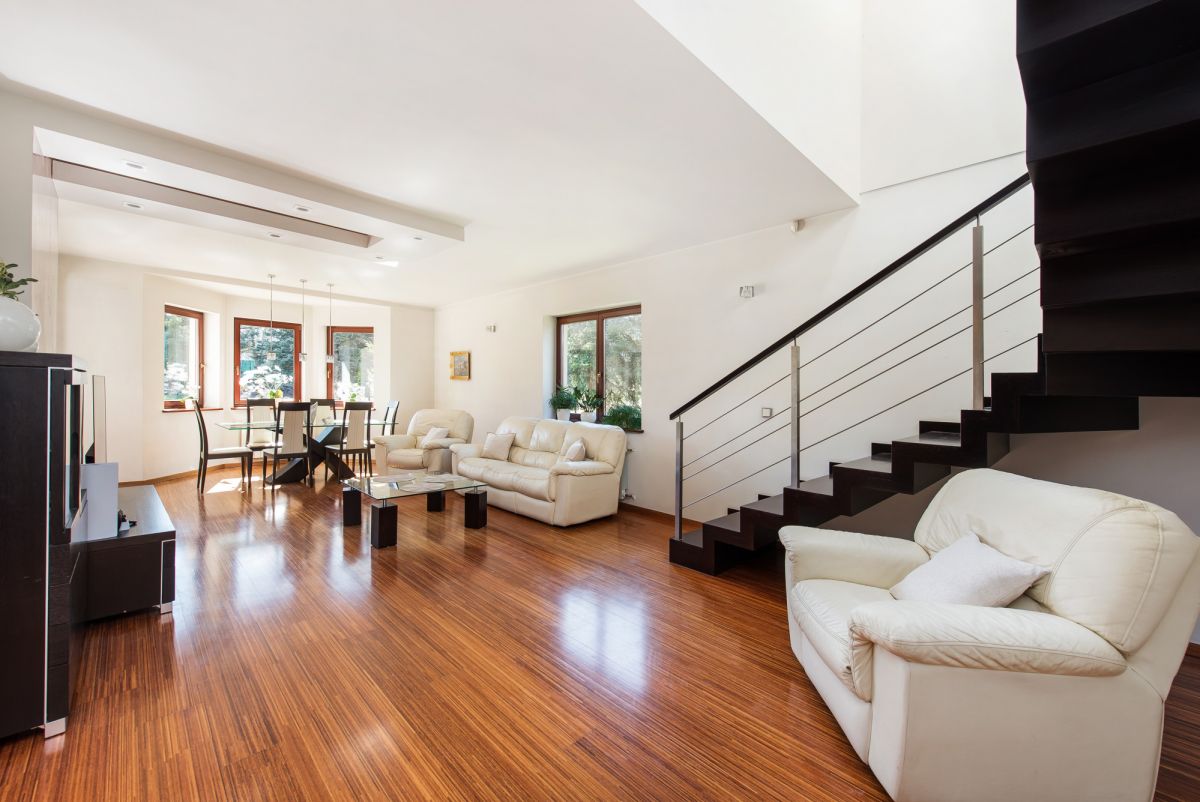 PARTER: korytarz, salon odgrodzony ścianką z kuchnią, w salonie sztukateria, skórzane kanapy, egzotyczna podłoga bambusowa, jasna i otwarta przestrzeń wychodząca na ogród, schody wykonane z drewna dębowego barwione na kolor Wenge, balustrada z elementów drewnianych z wypełnieniami, sypialnia, łazienka z oświetleniami (prysznic, umywalka, toaleta), pomieszczenie gospodarcze, garderoba, pralnia i garaż.