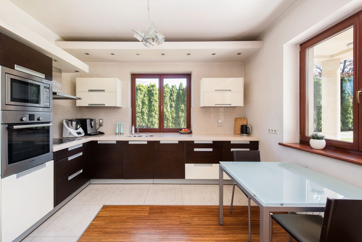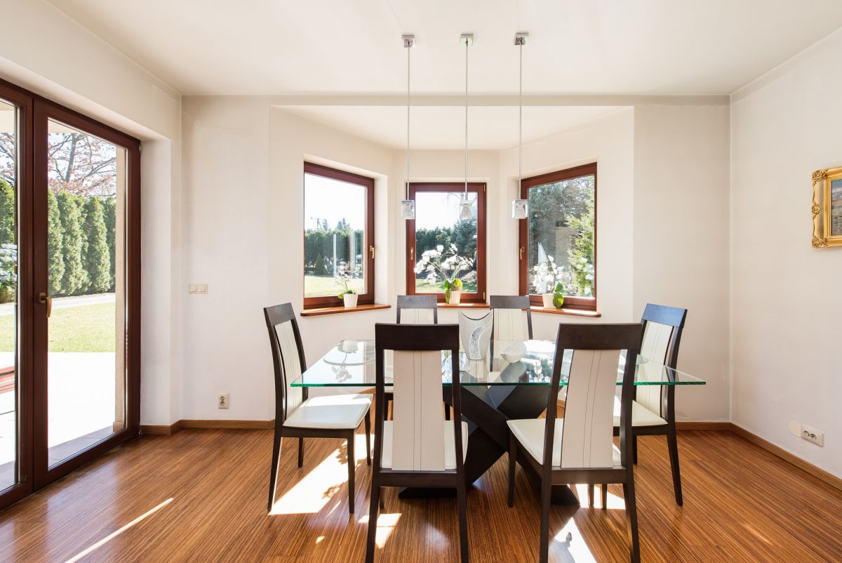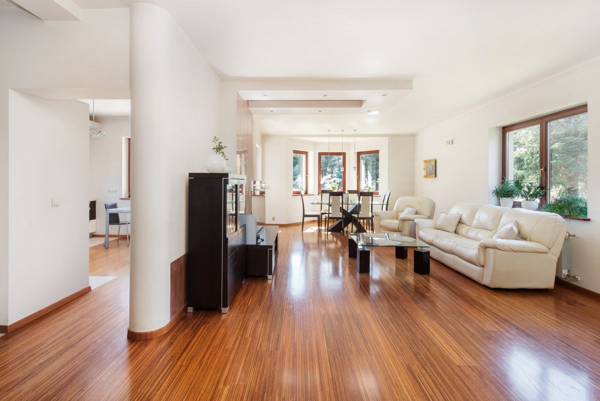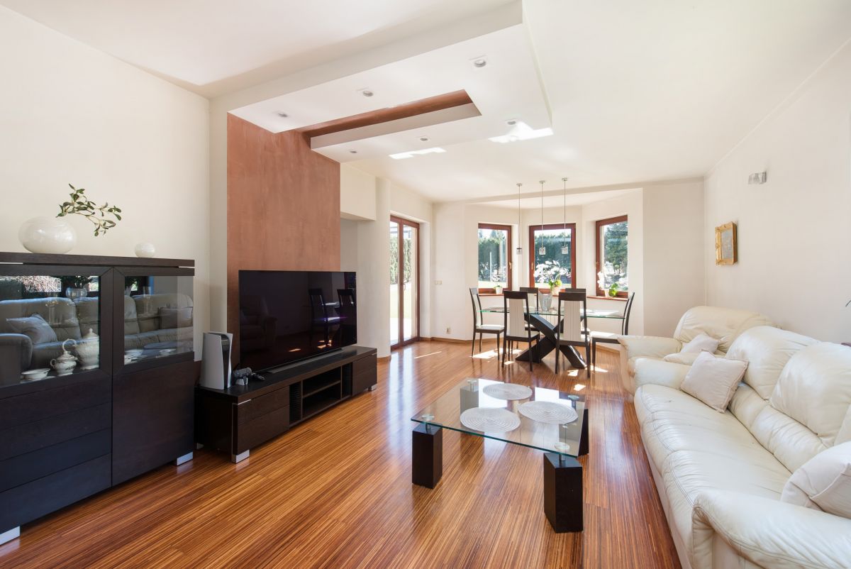 PARTER: korytarz, salon odgrodzony ścianką z kuchnią, w salonie sztukateria, skórzane kanapy, egzotyczna podłoga bambusowa, jasna i otwarta przestrzeń wychodząca na ogród, schody wykonane z drewna dębowego barwione na kolor Wenge, balustrada z elementów drewnianych z wypełnieniami, sypialnia, łazienka z oświetleniami (prysznic, umywalka, toaleta), pomieszczenie gospodarcze, garderoba, pralnia i garaż.