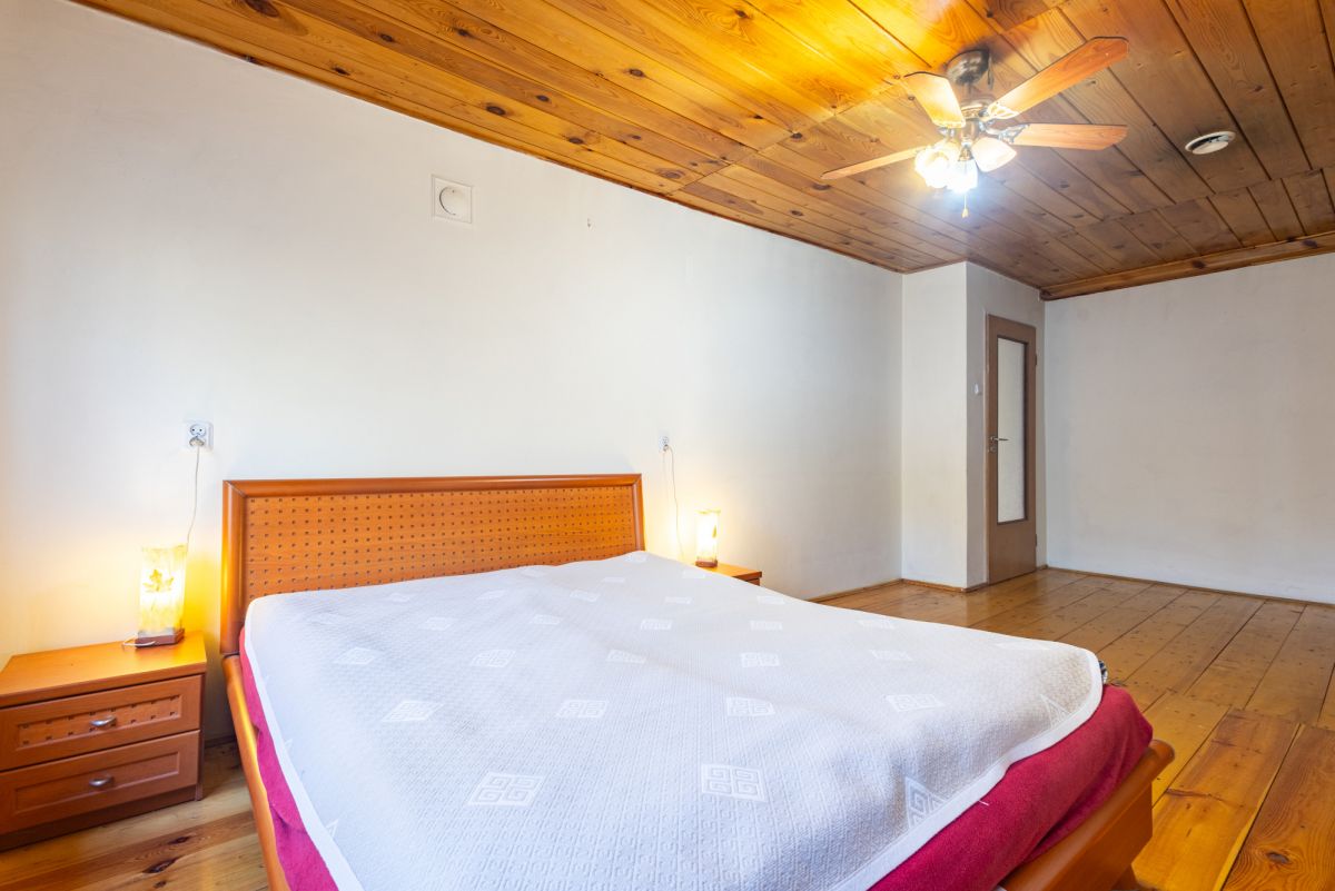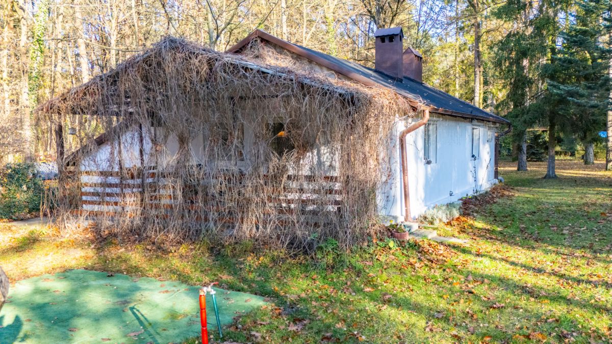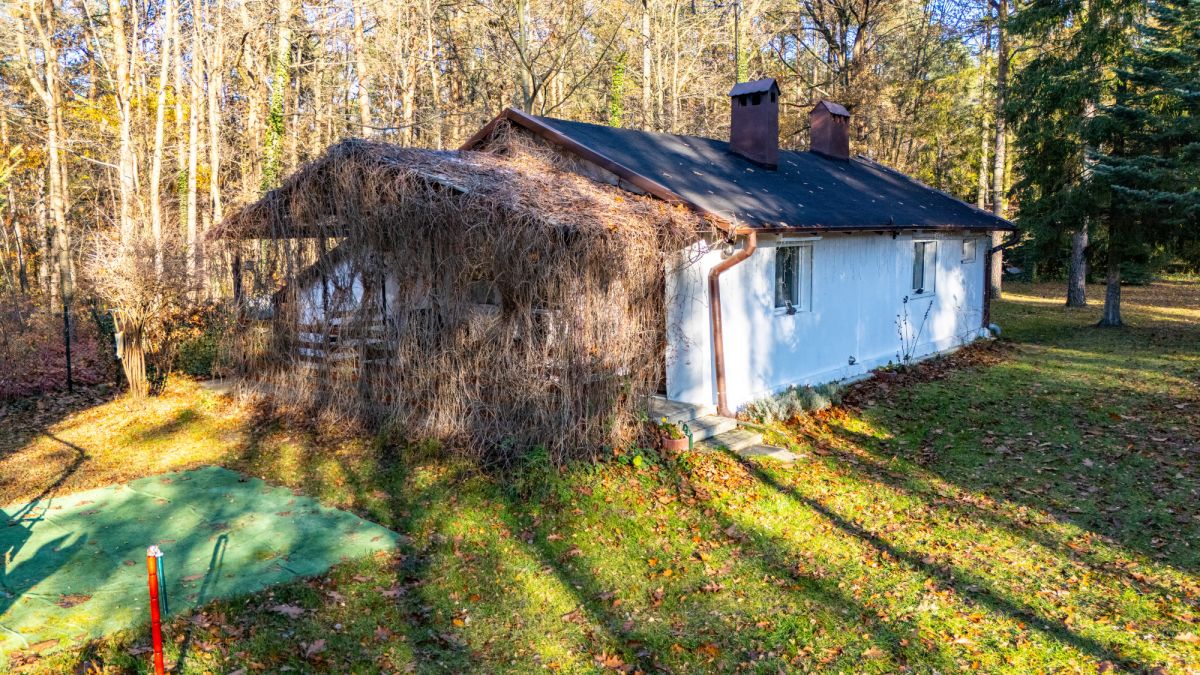 Dom został wybudowany w latach 1981-1985 z pustaków żelbetonowych, ocieplony styropianem o grubości 12 cm w części mieszkalnej, z dachem pokrytym papą. Budynek posiada status domu całorocznego, co czyni go odpowiednim zarówno do zamieszkania na stałe, jak i do wypoczynku w weekendy. Ogrzewanie kominkowe z rozprowadzeniem ciepła po całym budynku zapewnia komfort przez cały rok.