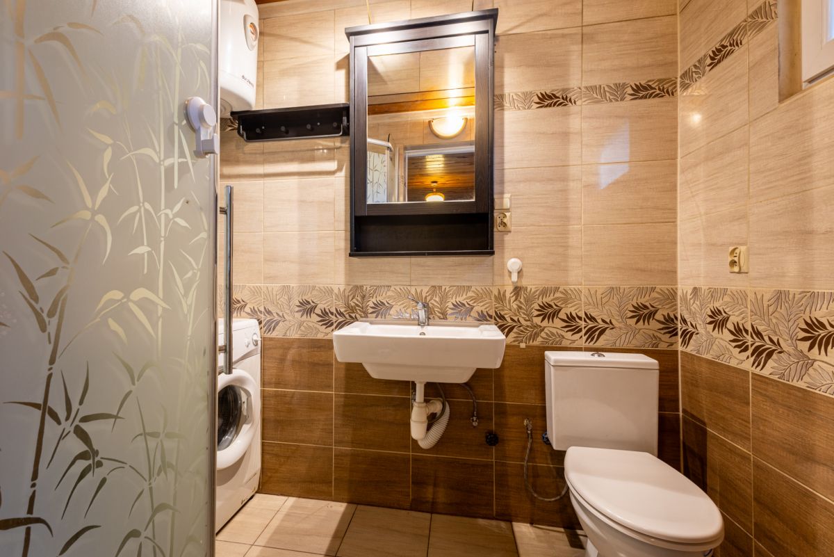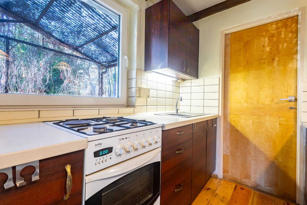 Wnętrze obejmuje salon z kominkiem, sypialnię, kuchnię, łazienkę z prysznicem i pralką oraz taras, który stanowi naturalne przedłużenie części dziennej i pozwala w pełni cieszyć się otaczającą przyrodą. Kuchnia wyposażona jest w kuchenkę gazową na butlę.