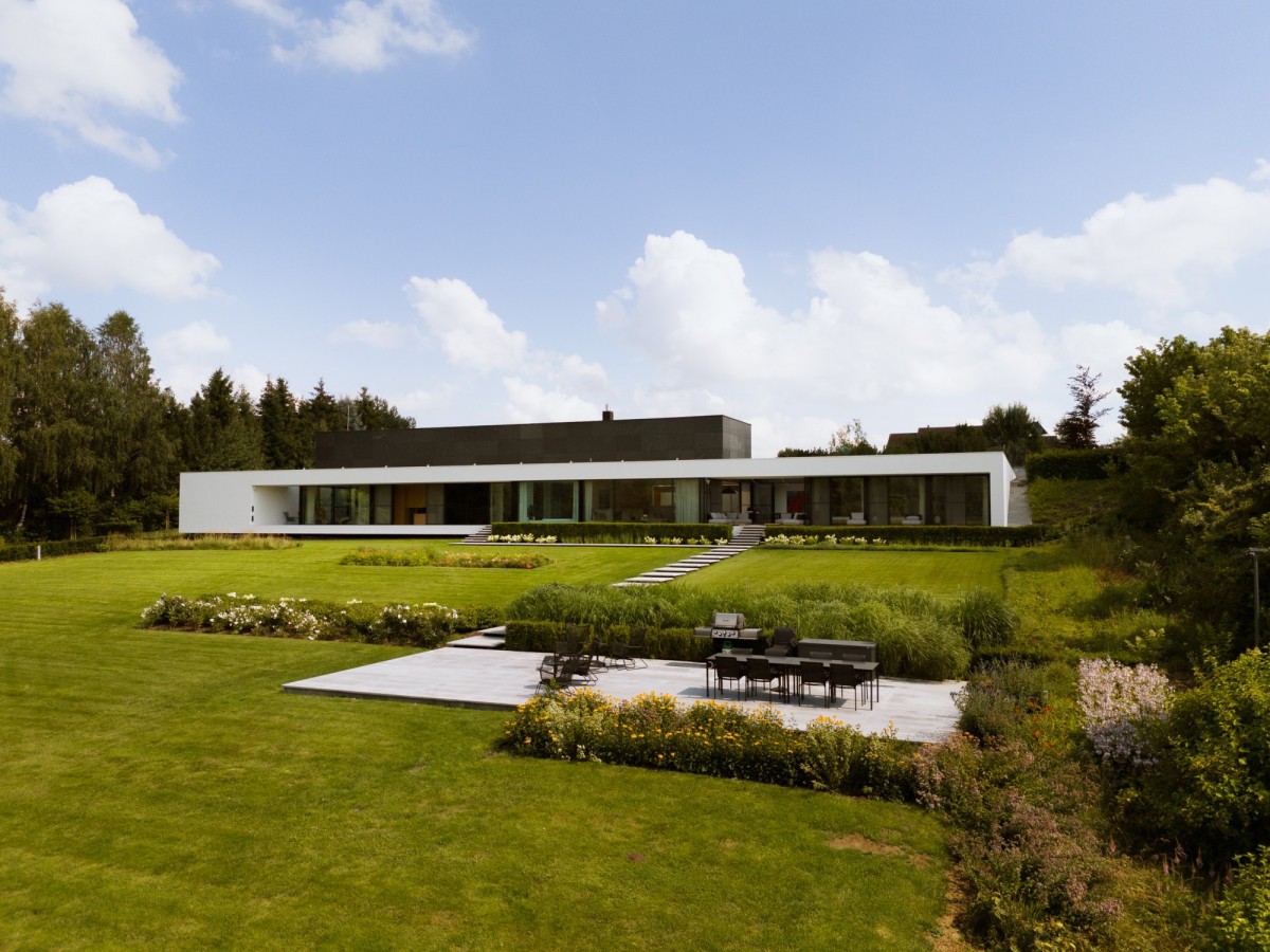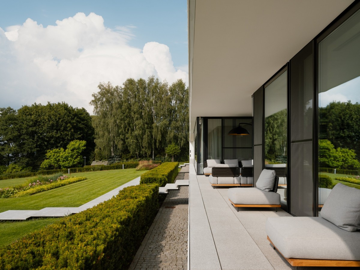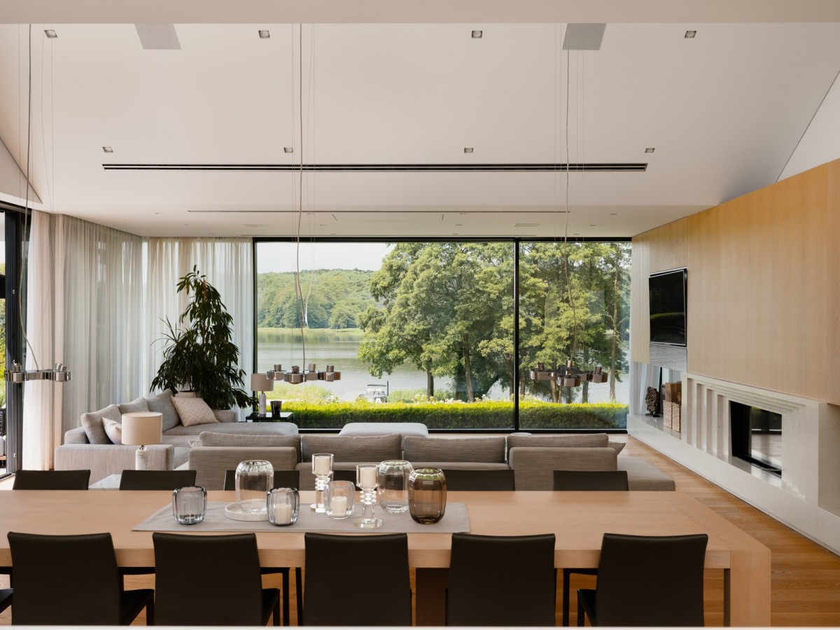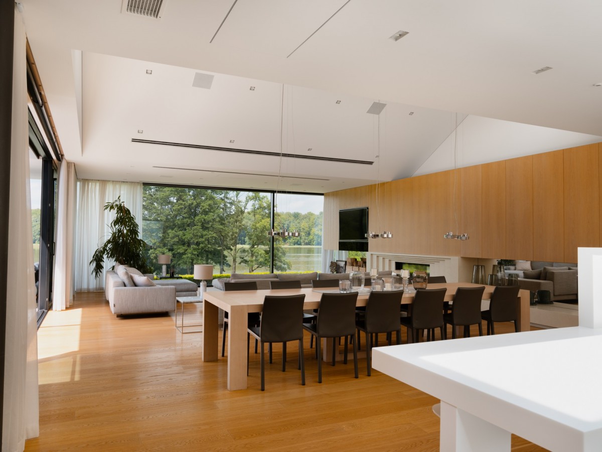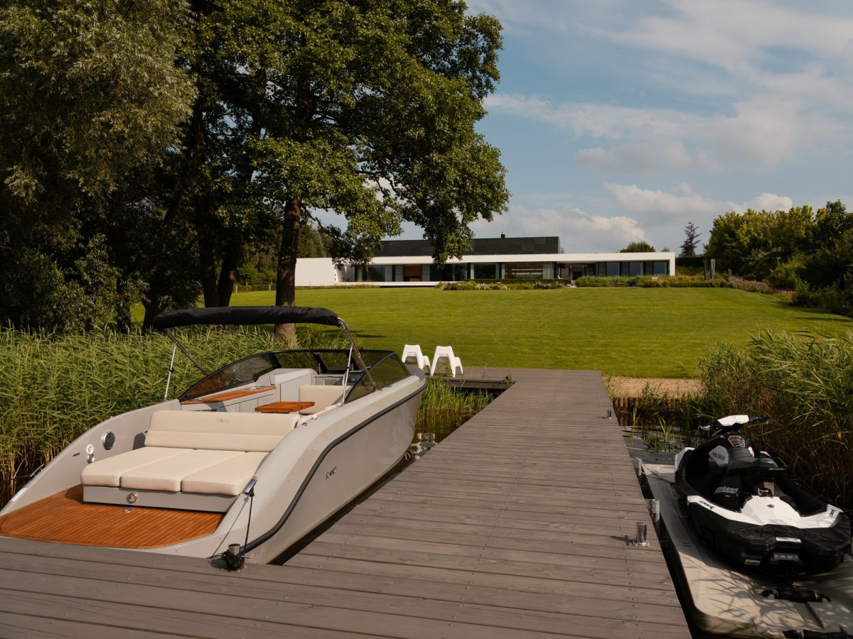 The house is equipped with a smart management system, heat recovery ventilation, air conditioning, a heated driveway, and a remotely retractable terrace roof with heating. The property also includes an attic with a server room, a garage for two cars, a utility room, storage space, and a garage for a boat or motorboat.