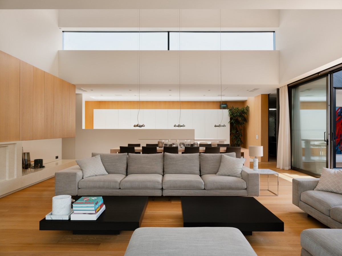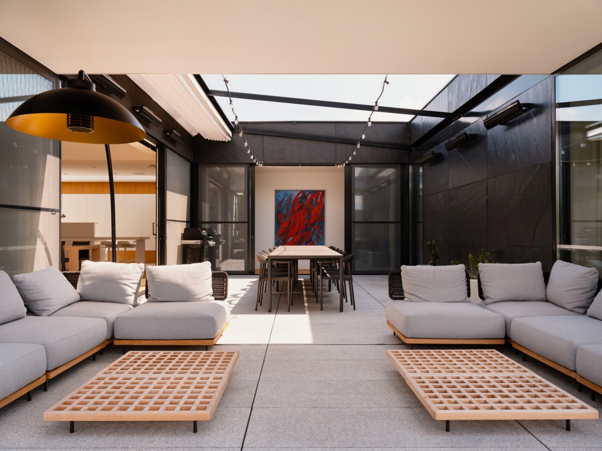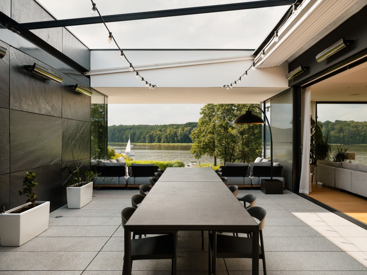 Dom wyposażono w inteligentny system zarządzania, rekuperację, klimatyzację, podgrzewany podjazd oraz zdalnie składane zadaszenie tarasu z ogrzewaniem. W skład nieruchomości wchodzą także strych z serwerownią, garaż na dwa samochody, kotłownia, część magazynowa oraz garaż na łódź lub motorówkę.