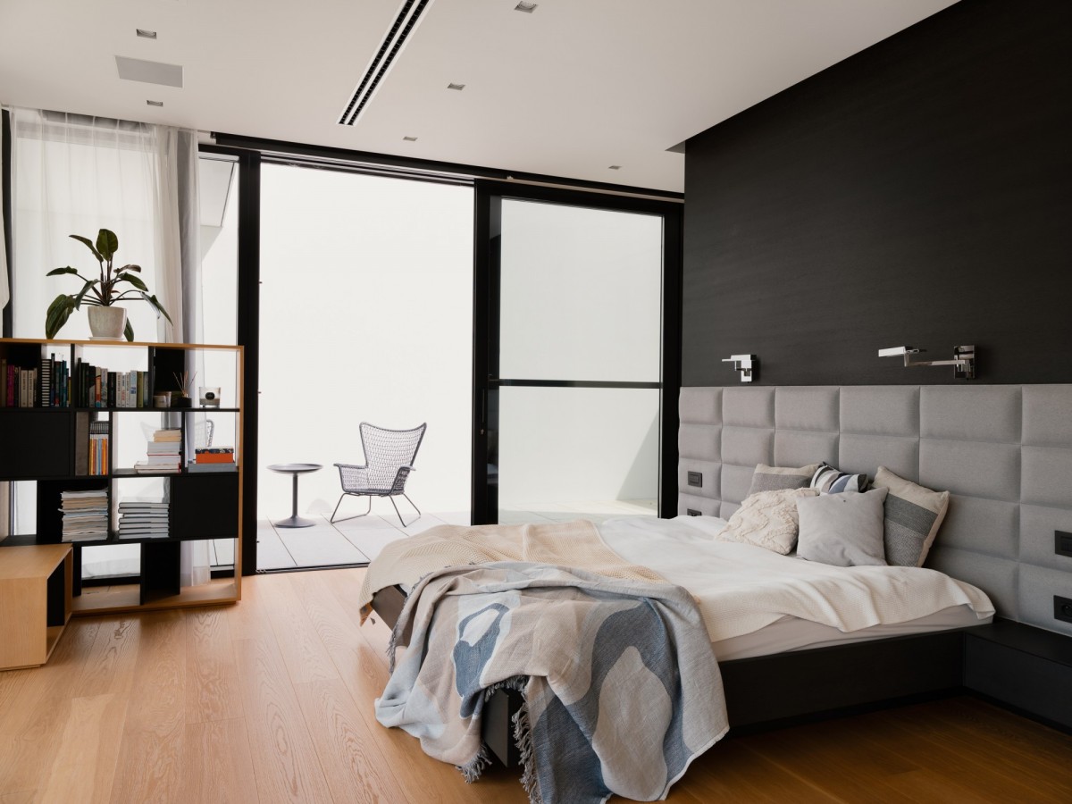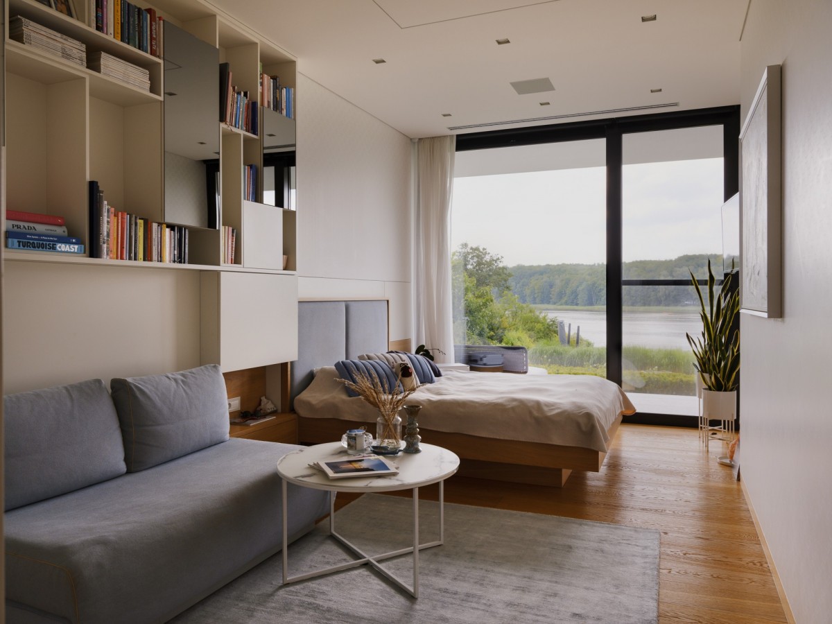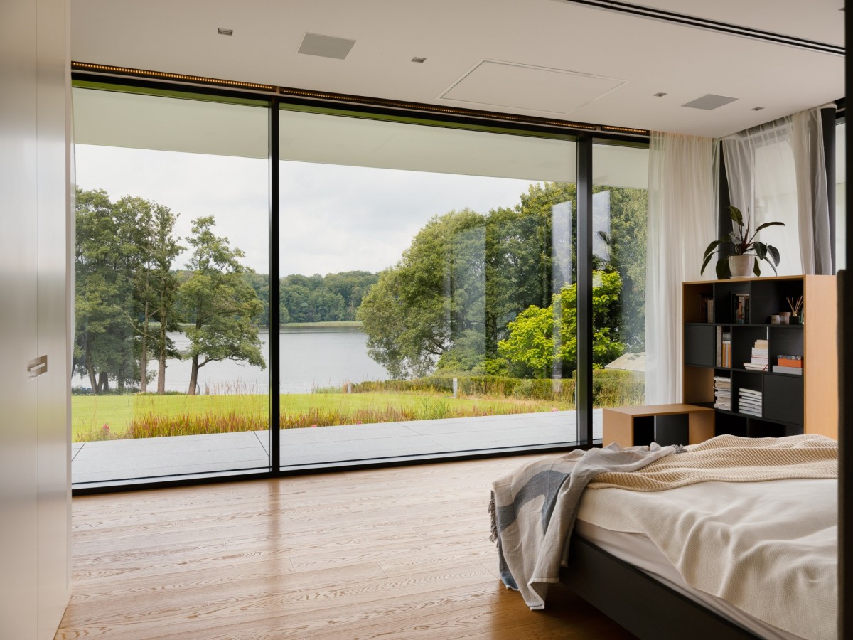 Three bedrooms with direct access to the terrace, each featuring large windows providing a lake view. A spacious bathroom with natural light.