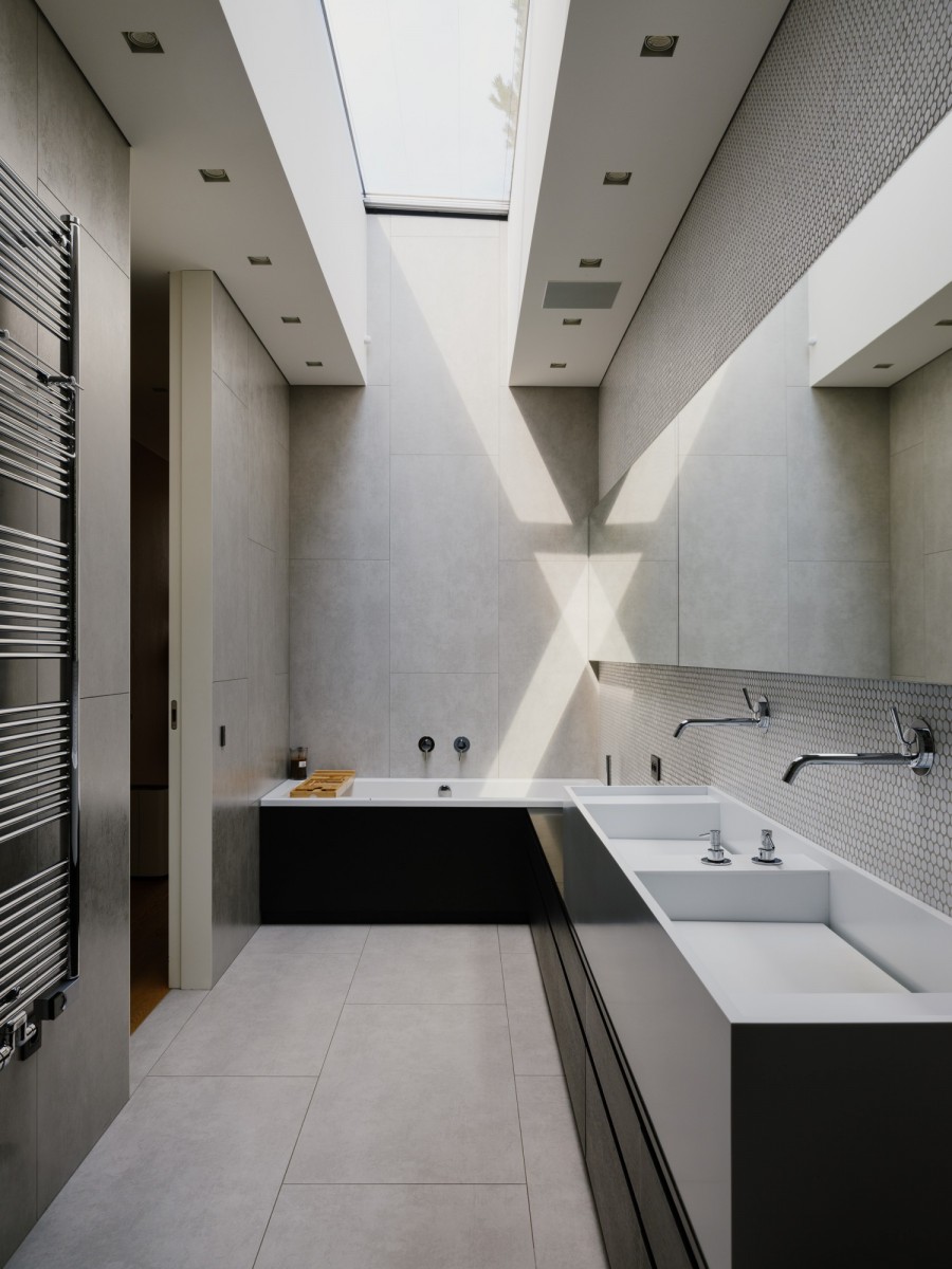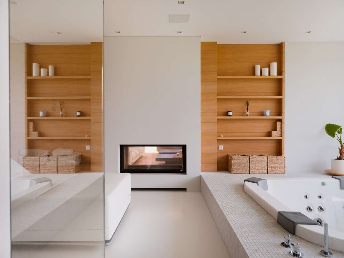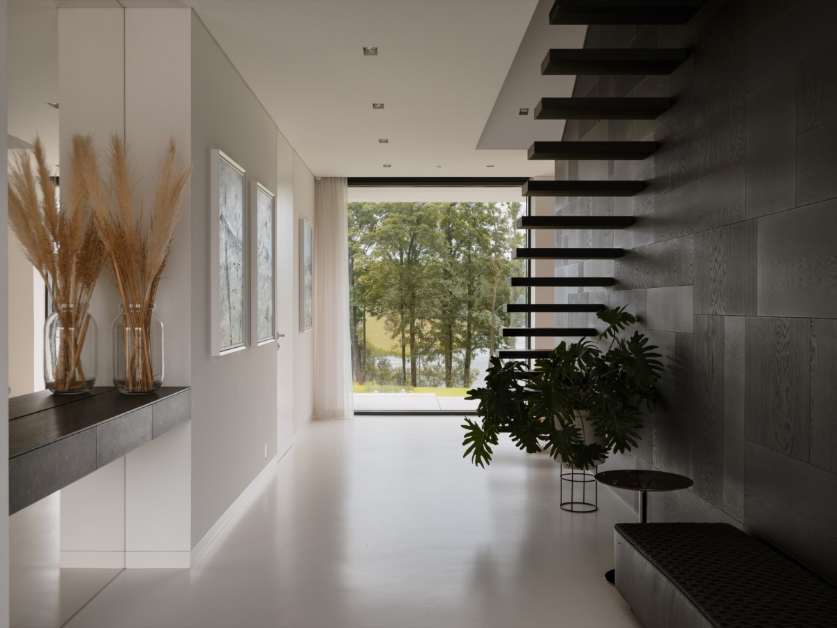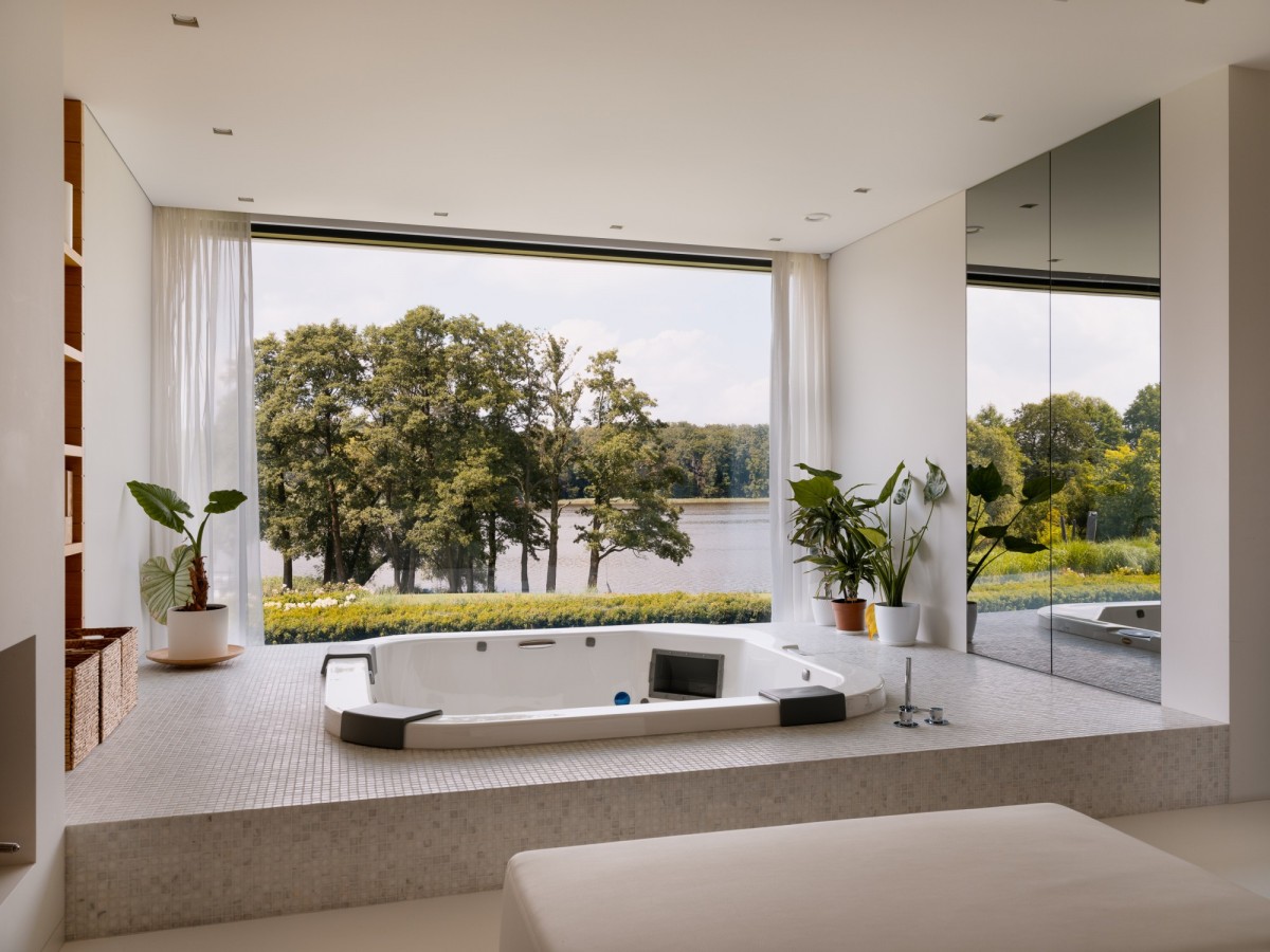 Wnętrza domu są utrzymane w nowoczesnym stylu, z eleganckim wykończeniem. Sypialnia master suite, pokój SPA oraz wszystkie sypialnie i salon posiadają bezpośrednie wyjście na taras, oferując niepowtarzalny widok na jezioro. Pokój SPA i salon dzielą wspólny kominek, co dodaje ciepła i przytulności wnętrzom. Aneks kuchenny wyróżnia się doświetleniem sufitu, zapewniającym naturalne światło i przestronność. Pokój kinowy z bilardem jest doskonałym miejscem do relaksu i rozrywki. Duży taras stanowi centralny punkt domu, idealny do spotkań towarzyskich i odpoczynku na świeżym powietrzu.