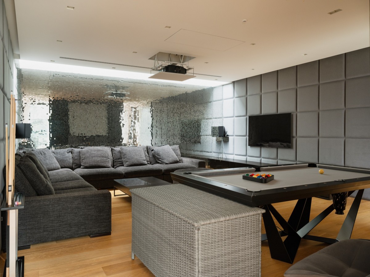 A spacious living room with an open kitchen and access to a large terrace, a cinema room with a billiard table, a SPA room with a jacuzzi, sauna, and bathroom, a laundry room, and a wardrobe. All rooms offer panoramic lake views, creating a unique atmosphere.