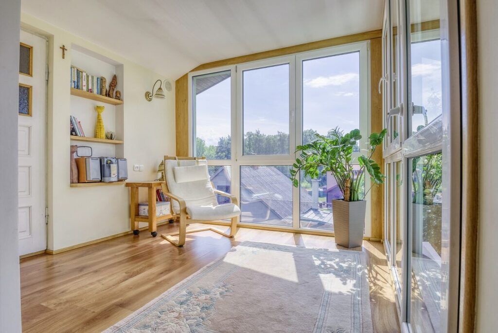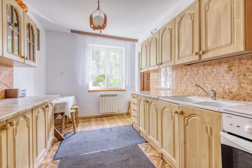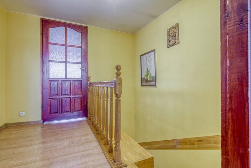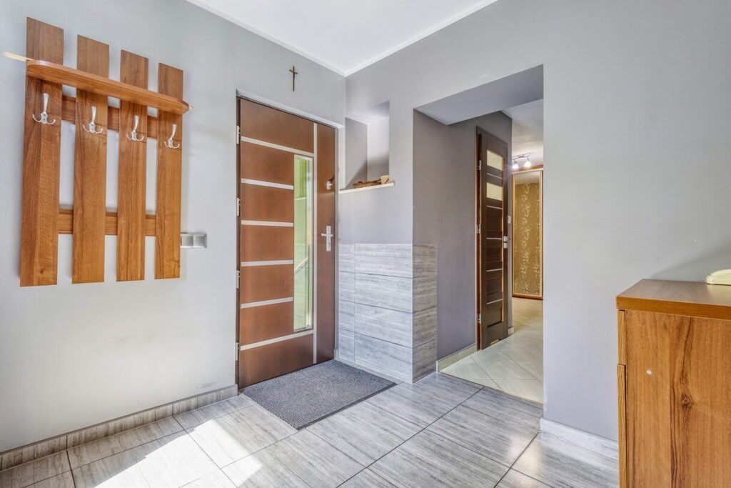 Poziom posiada oddzielne wejście, istnieje również przejście na piętro dębowymi schodami. Drzwi wejściowe, antywłamaniowe.