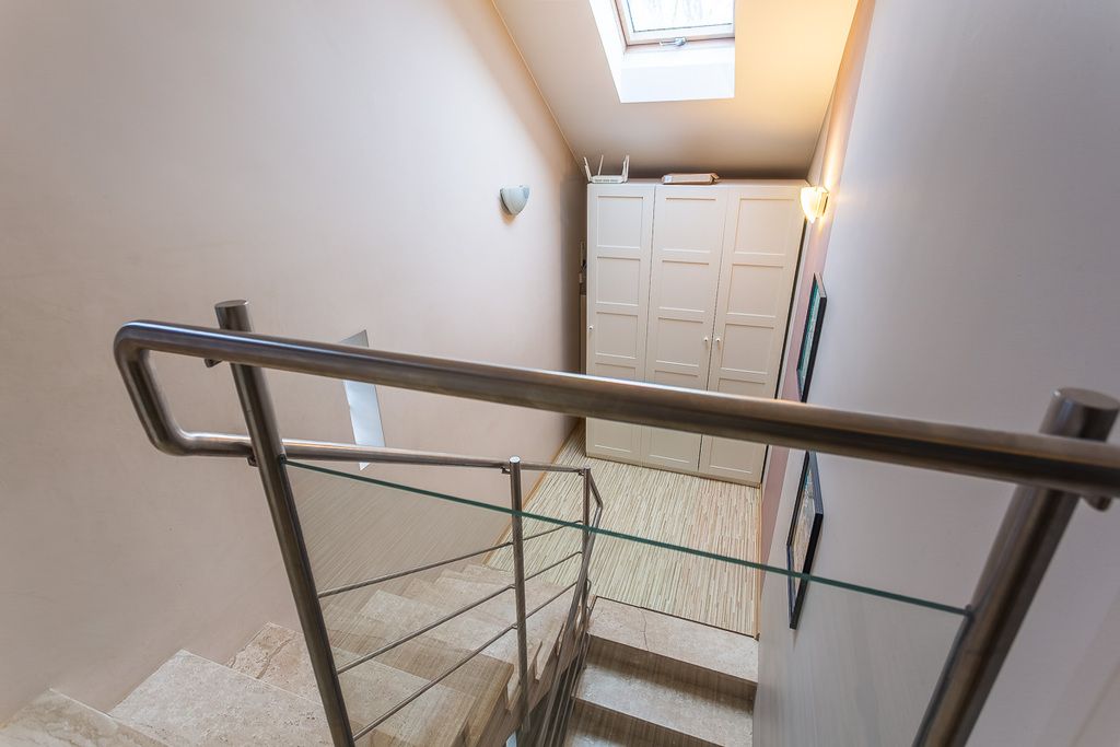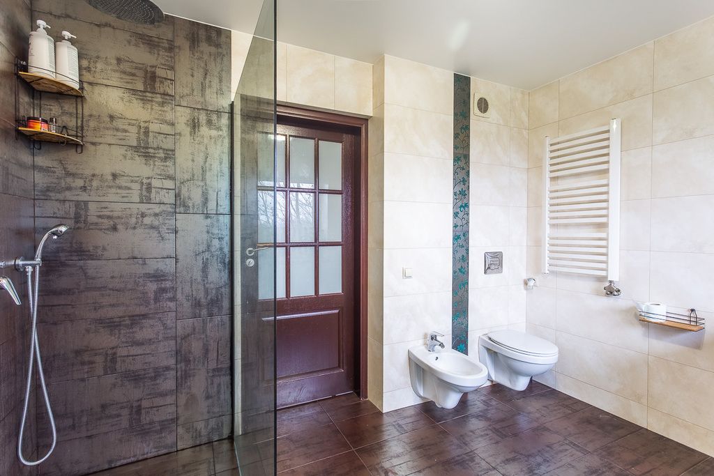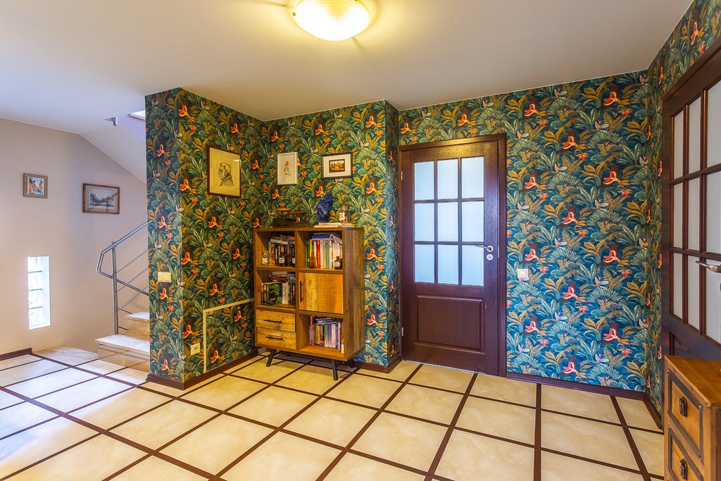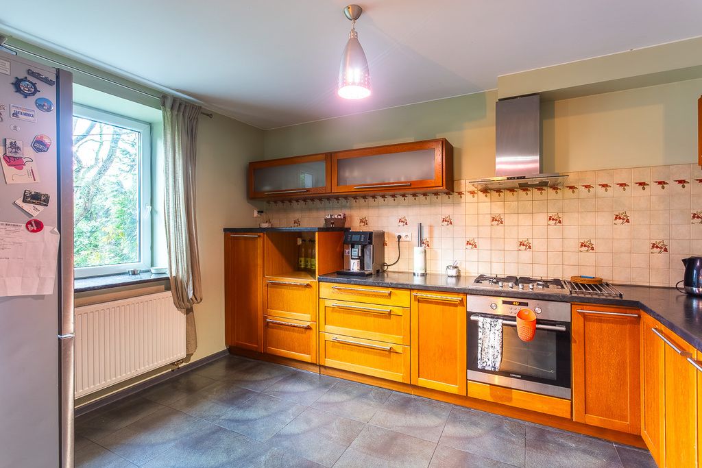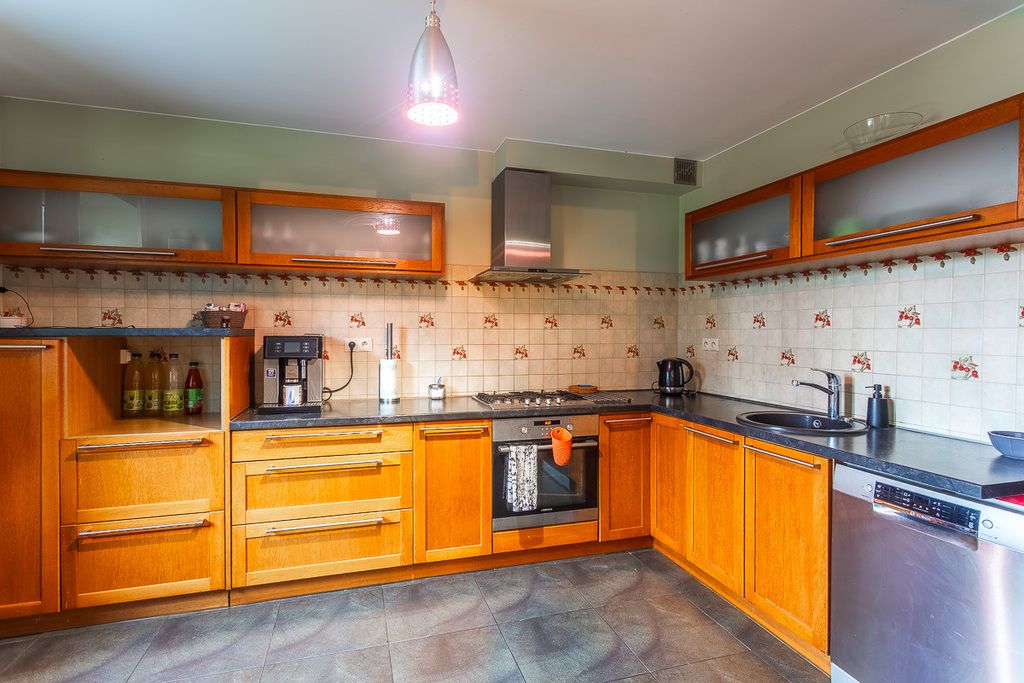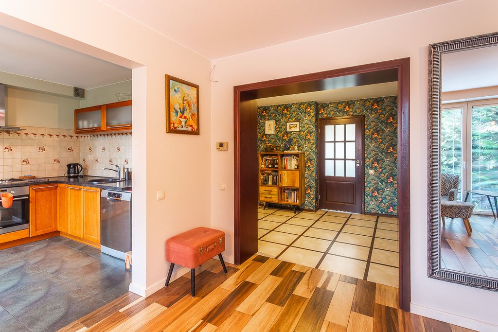 Wnętrze składa się z 5 pokoi, w tym widnej kuchni wyposażonej w meble w zabudowie, lodówkę, zmywarkę, okap oraz piekarnik. W domu znajdują się 2 łazienki z wanną, umywalką, WC, bidetem, podgrzewanymi podłogami, grzejnikiem drabinkowym oraz oknem, a także dodatkowa toaleta. Podłogi wykończone panelami. Do dyspozycji jest garderoba oraz pomieszczenie gospodarcze.