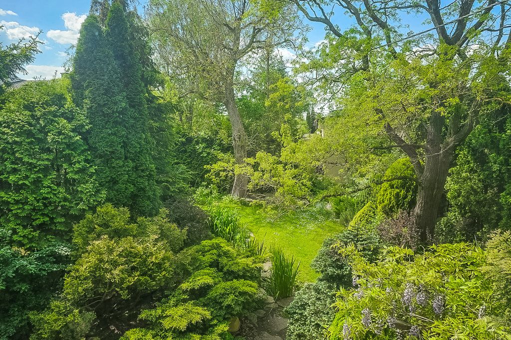 Działka o kształcie prostokąta, płaska, ogrodzona metalowym ogrodzeniem. Na działce znajduje się zadbany ogród z drzewami, oczkiem wodnym, altanką oraz trawnikiem. Z okien domu rozpościera się widok na pola, co zapewnia poczucie przestrzeni i spokoju.