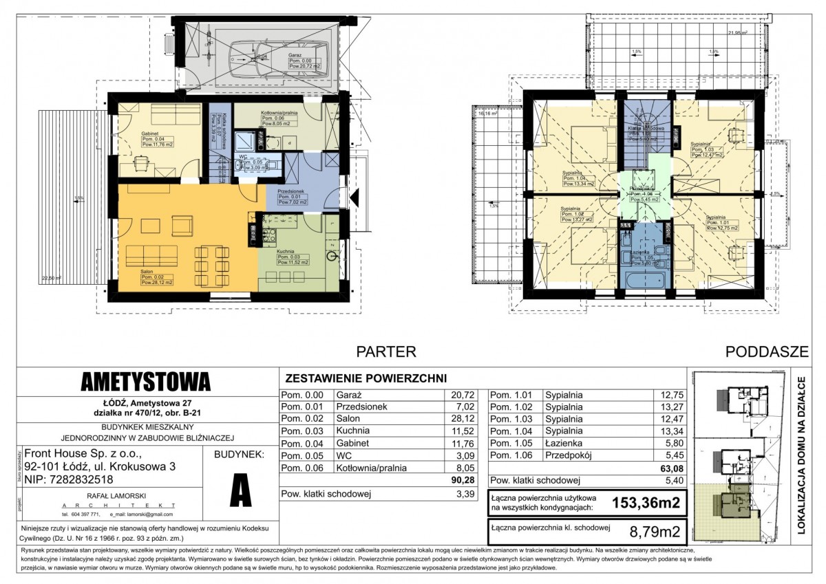 Łączna powierzchnia parteru i piętra: 153,36m2 (powierzchnia jest jednakowa dla budynku A i budynku B), budynki zaprojektowane zostały z tarasami nad garażami oraz balkonami z wyjściem z każdej sypialni. W zestawieniu powierzchni nie uwzględniono klatki schodowej, której powierzchnia wynosi 3,39m2 na parterze oraz 5,40m2 na piętrze.