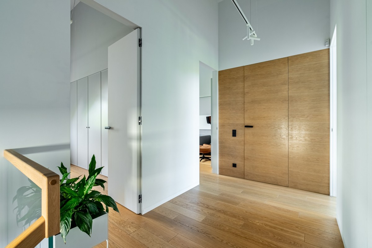Dom posiada parter i piętro, rozgraniczając w ten sposób strefę dzienną salonu, kuchni i jadalni, od strefy sypialni, pokoju telewizyjnego ( relaksacyjnego) i gabinetu.