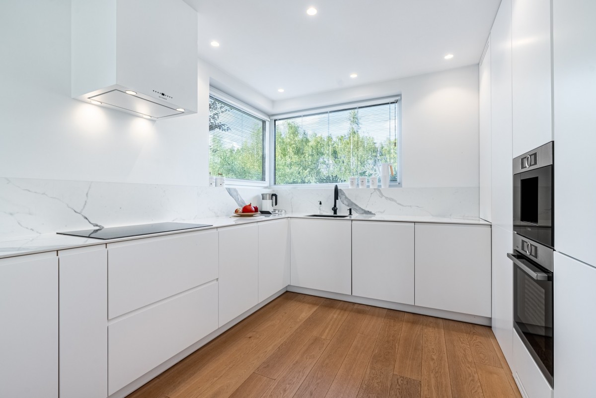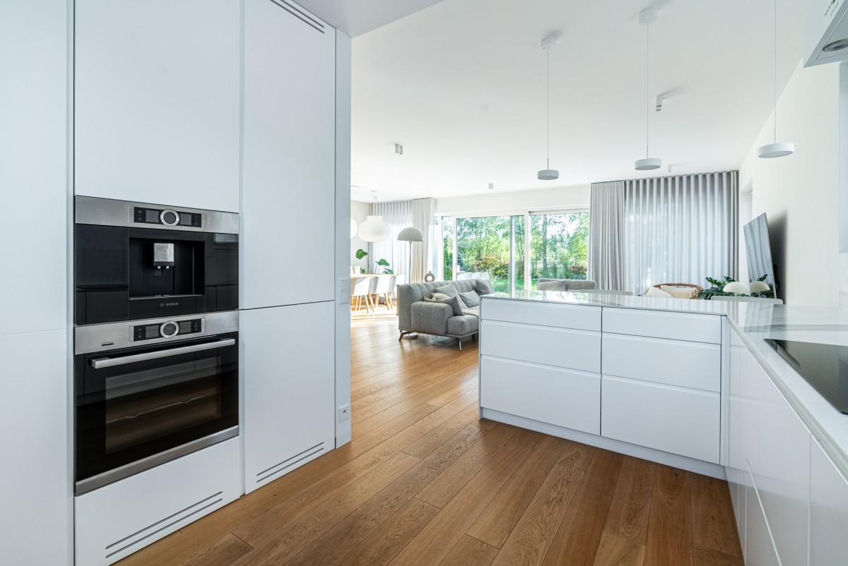 Kuchnia łącząca się półwyspem z salonem zaprojektowana została w sposób bardzo ergonomiczny, z pojemnymi ciągami szafek, cargami i nowoczesnymi sprzętami agd które zostały w niej użyte, jest tam m.in.: wbudowany ekspres do kawy firmy Bosch, taki sam piekarnik z funkcją grilla i parownika, samoczyszczący wraz z sądą do temperatury, duża zmywarka, większa, bo 5 stanowiskowa płyta indukcyjna, nowoczesny okap Faber. W kuchni jest naprawdę sporo miejsca, przewidziano dużo przestrzeni odkładczych, mamy również duże okno doświetlające to pomieszczenie.