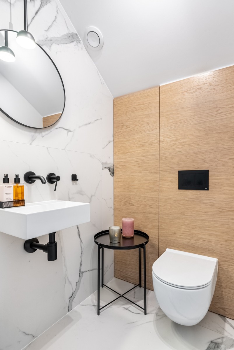 Na dole domu, tuż przy schodach jest małe WC, również tam właściciele zadbali o detale tj. nowoczesne oświetlenie czy dobrą armaturę ( firma HushLab), jest również instalacja zmiękczająca wodę.