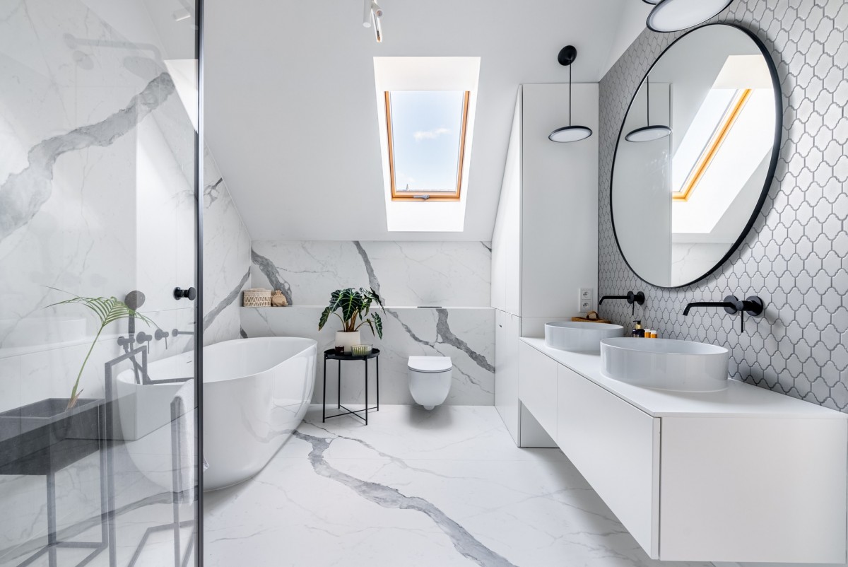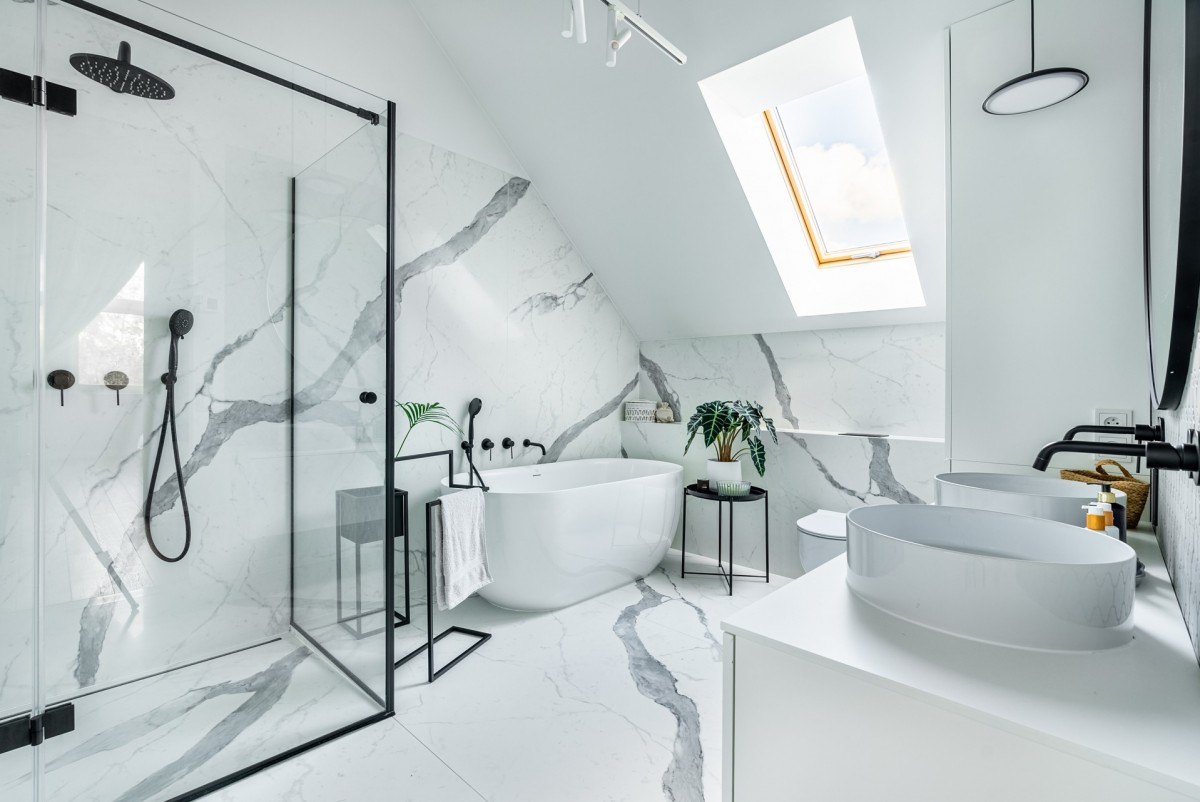 - łazienka na górze: duża kabina prysznicowa z liniowym odpływem, wanna wolnostojąca, na podłodze i ścianach spiek kwarcowy;
