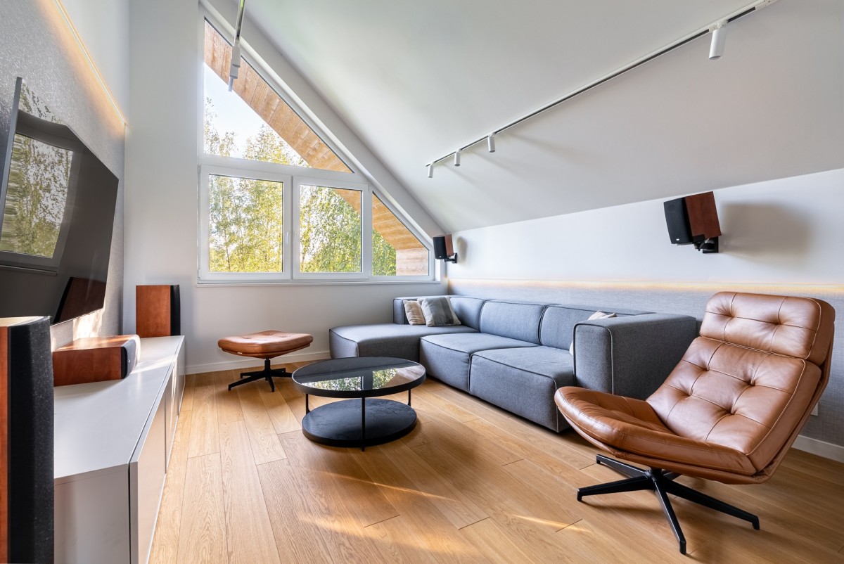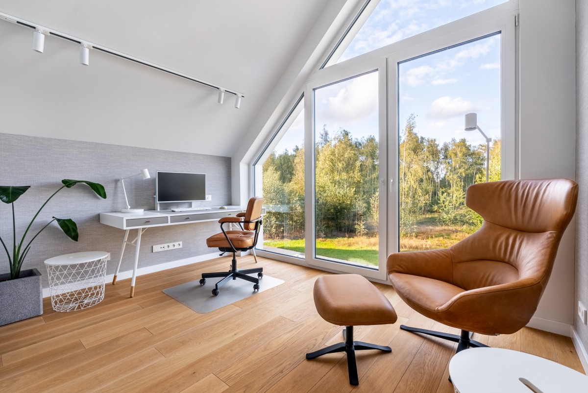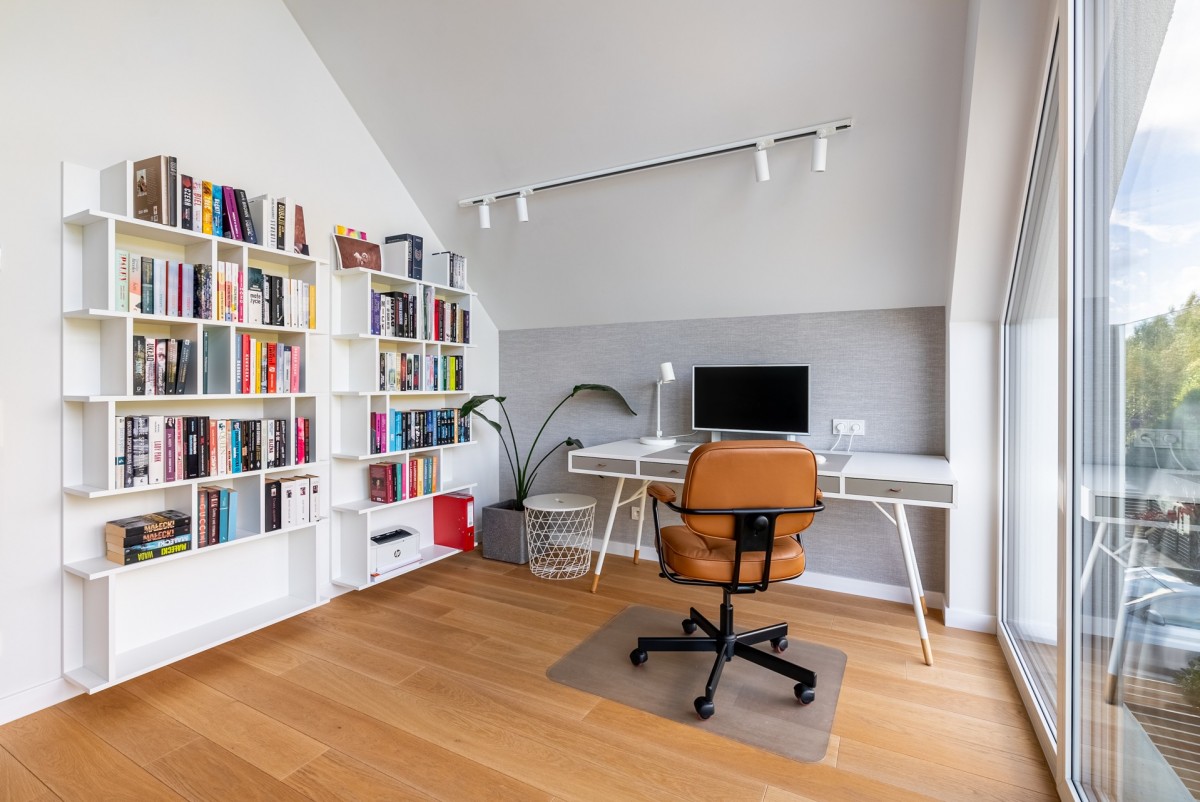 Niewątpliwym atutem góry tego domu są asymetryczne, duże okna w pokojach wysokich na ok 5 m, które otwierają dom na piękną, zieloną okolicę. Również górę domu właściciele zaaranżowali dla swoich potrzeb, wydzielając głęboką garderobę przy pokojach które, oprócz głównej sypialni, są gabinetem oraz pokojem z dużą biblioteczką, kącikiem muzycznym i telewizorem. Nie ma tam niepotrzebnych przestrzeni, całe wnętrze jest zaaranżowane przez architekta wnętrz z najlepszych materiałów wykończeniowych, na uwagę zasługuje designerskie oświetlenie w całym domu.