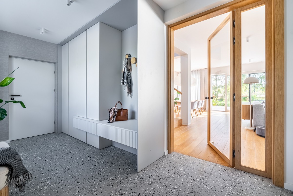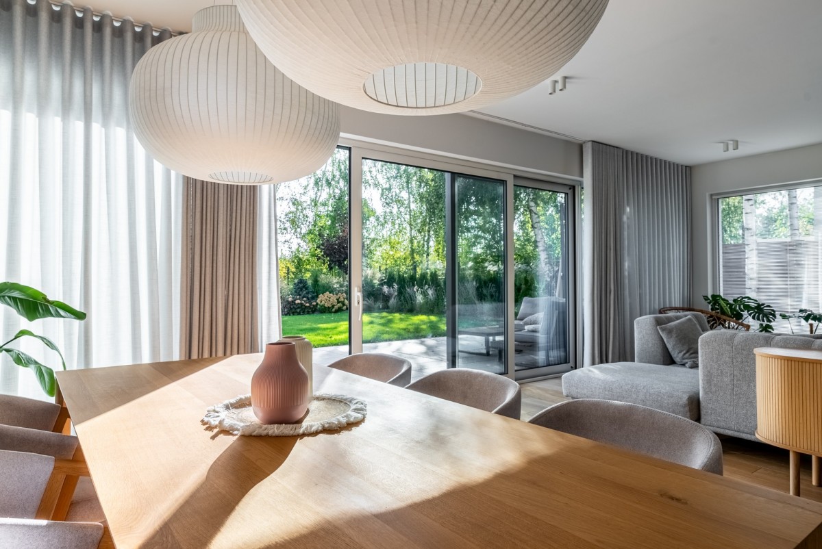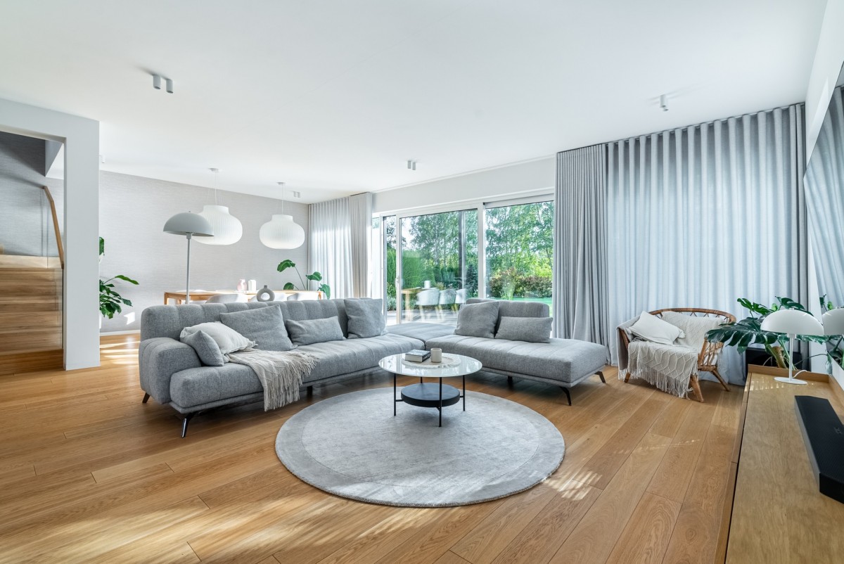 Parter domu został trochę przeprojektowany przez właścicieli, względem jego pierwotnego rzutu, zrezygnowano z małego gabinetu na korzyść ustawnego holu z dużą szafą na odzież wierzchnią i wygodnego miejsca przy wejściu. Bardzo ciekawe aranżacyjnie są szklano drewniane drzwi prowadzące do salonu i części kuchennej o łącznej powierzchni ponad 60 m2. Salon jest niezwykle doświetlony z ekspozycja okien południowo zachodnią, z oknami w systemie HS, zapewniającymi mnóstwo naturalnego światła. Duża przestrzeń salonu umożliwiła wydzielenie miejsca na jadalnię i dużą kanapę.