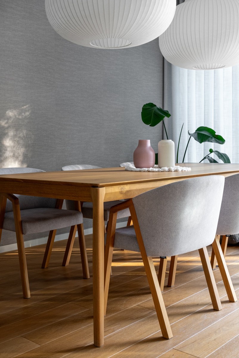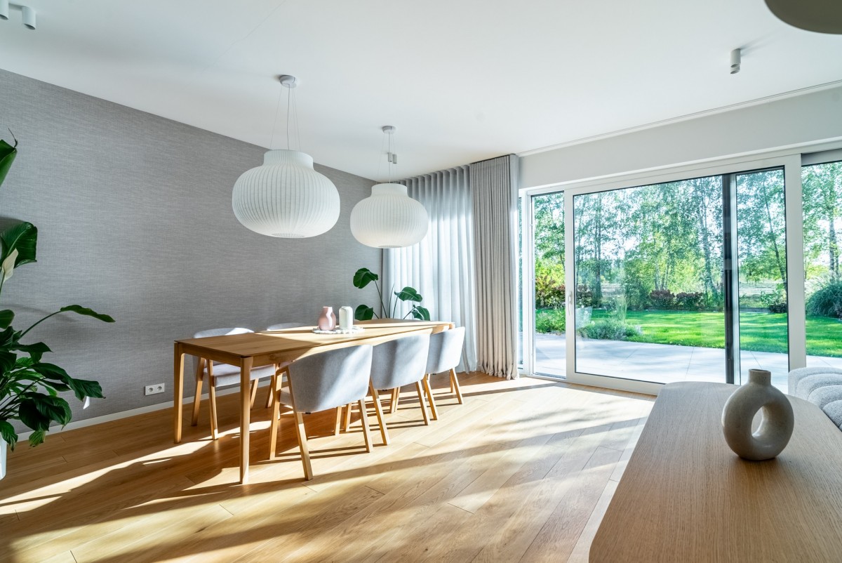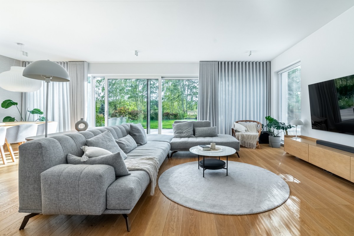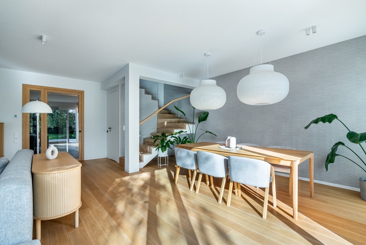 Parter domu został trochę przeprojektowany przez właścicieli, względem jego pierwotnego rzutu, zrezygnowano z małego gabinetu na korzyść ustawnego holu z dużą szafą na odzież wierzchnią i wygodnego miejsca przy wejściu. Bardzo ciekawe aranżacyjnie są szklano drewniane drzwi prowadzące do salonu i części kuchennej o łącznej powierzchni ponad 60 m2. Salon jest niezwykle doświetlony z ekspozycja okien południowo zachodnią, z oknami w systemie HS, zapewniającymi mnóstwo naturalnego światła. Duża przestrzeń salonu umożliwiła wydzielenie miejsca na jadalnię i dużą kanapę.