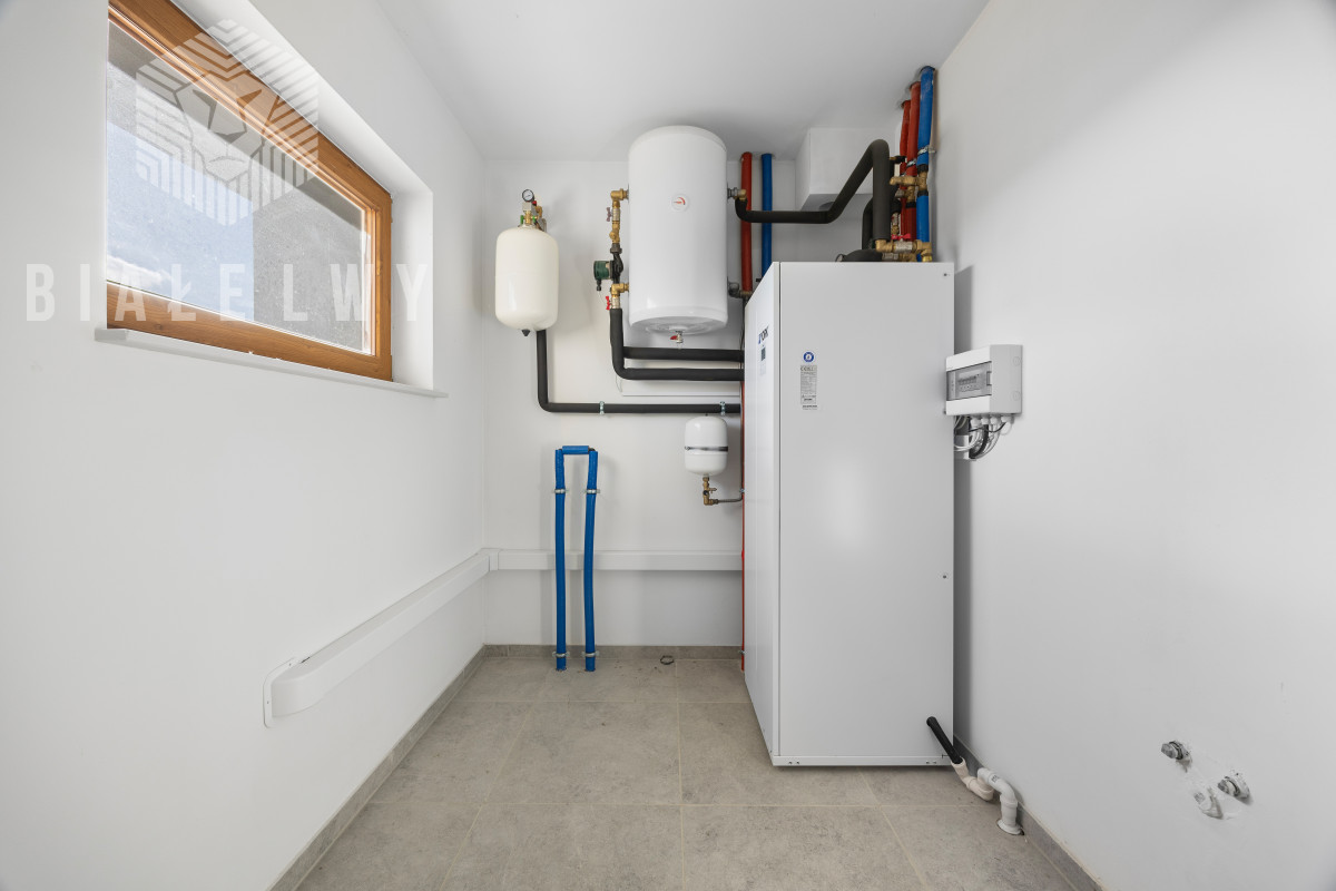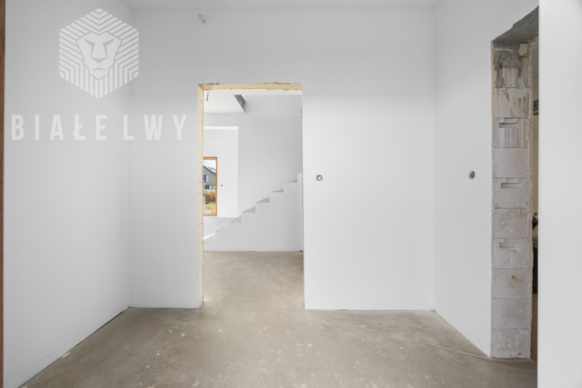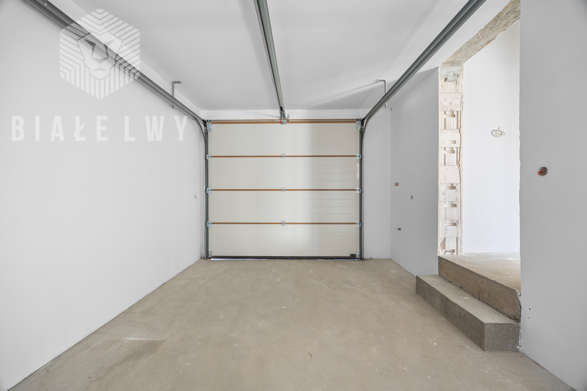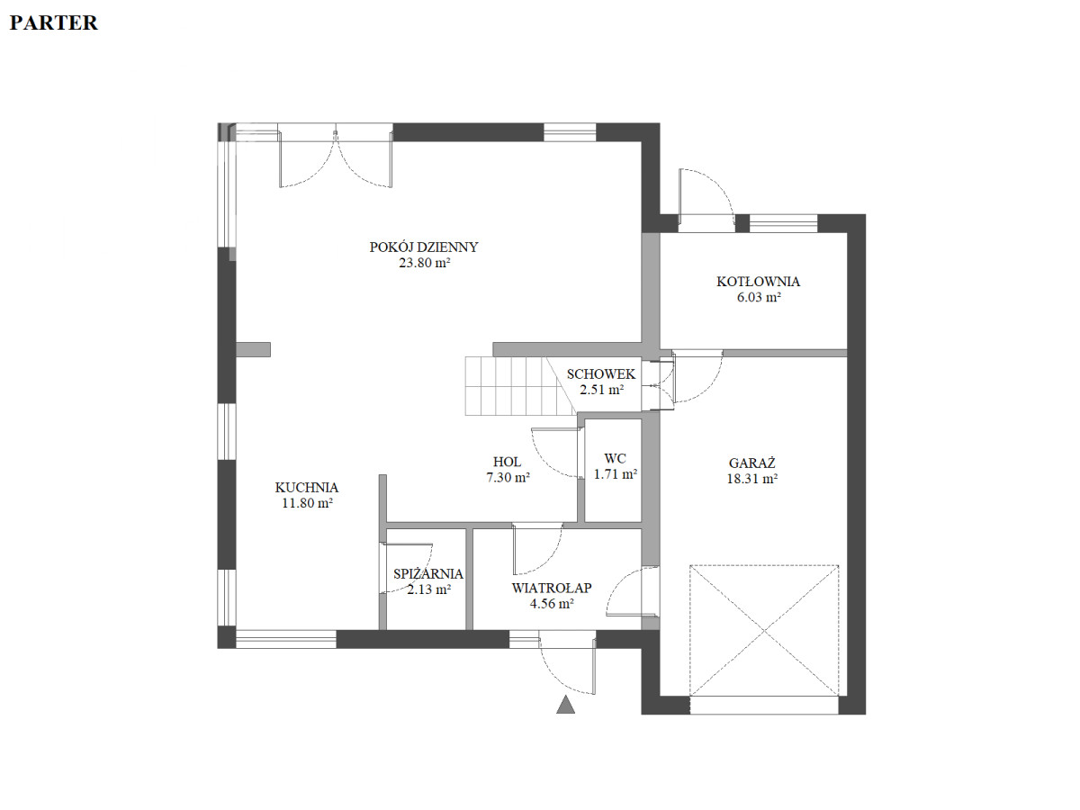 • Parter: salon z jadalnią i wyjściem na ogród, kuchnia, łazienka, pomieszczenie gospodarcze, wiatrołap, garaż.