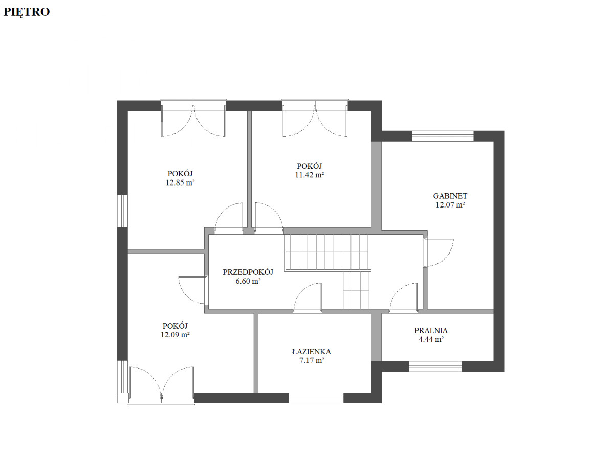 • Piętro: trzy sypialnie, duża łazienka, mała łazienka, garderoba, pralnia, gabinet.