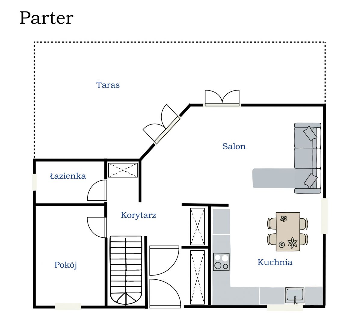 Na parterze znajduje się przedpokój/wiatrołap, pokój idealny pod sypialnię lub gabinet, łazienka duży salon połączony z jadalnią i kuchnią.