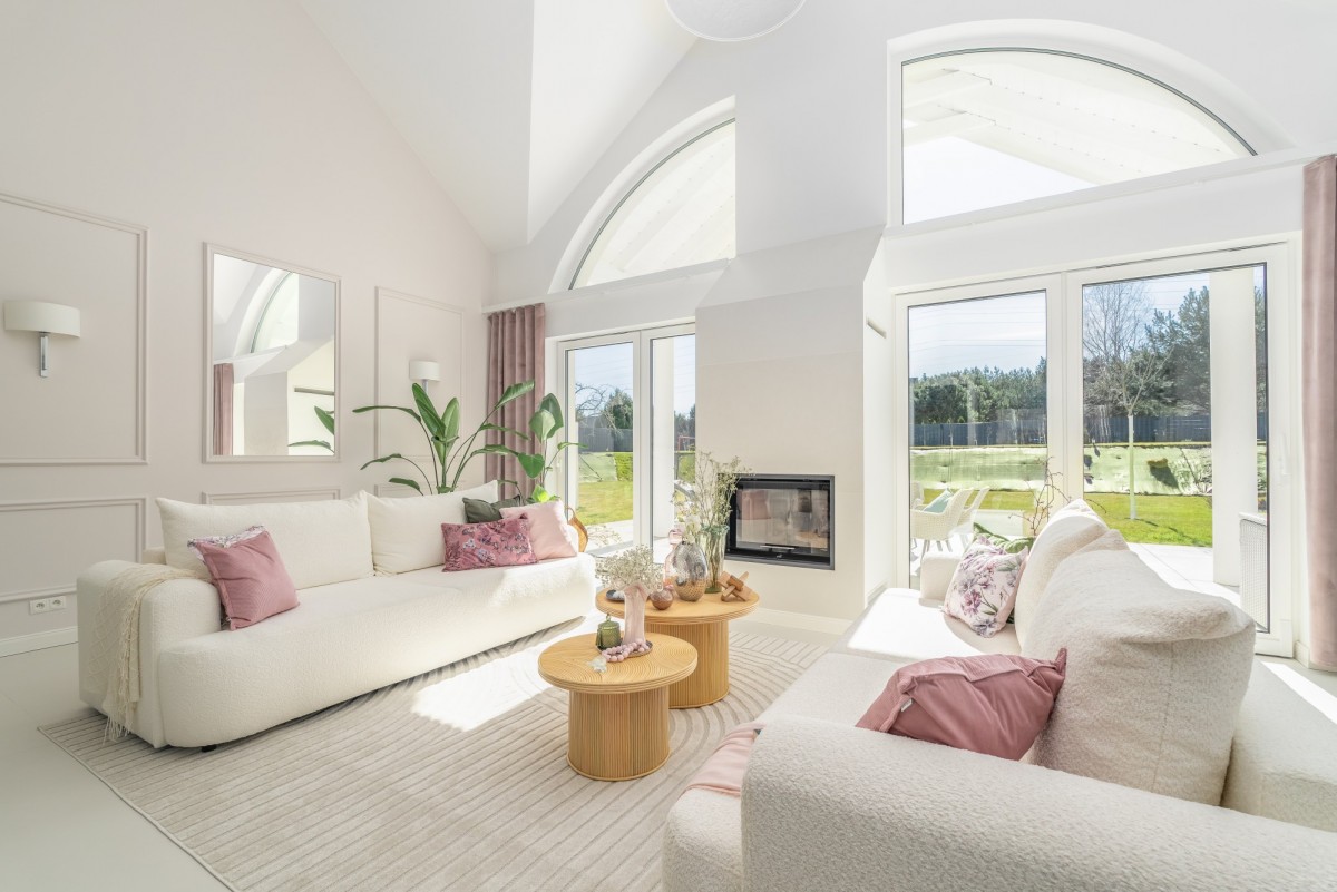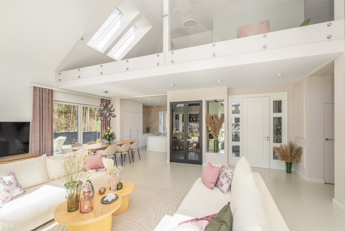 - Salon z antresolą stanowi "serce domu", to imponująca ponad 40-metrowa przestrzeń z panoramicznymi przeszkleniami, widokiem na ogród i las oraz naturalnym światłem przez cały dzień.