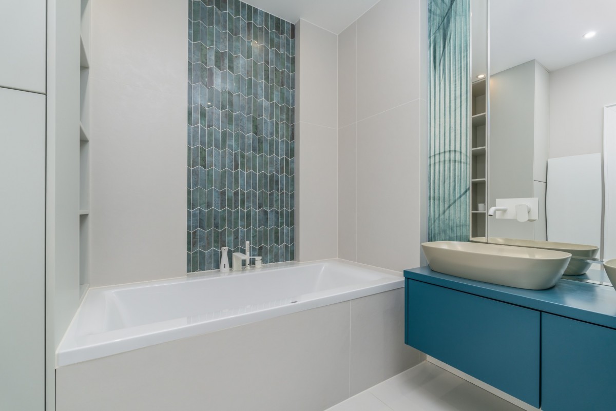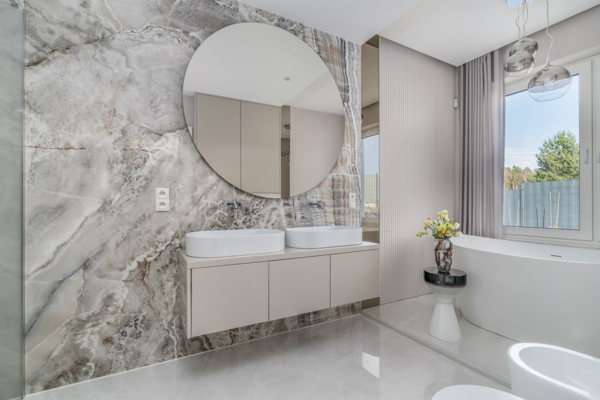 Na podłogach zastosowano wysokiej klasy gres, spieki oraz panele winylowe, a ściany wykończono gładziami i tynkami premium.