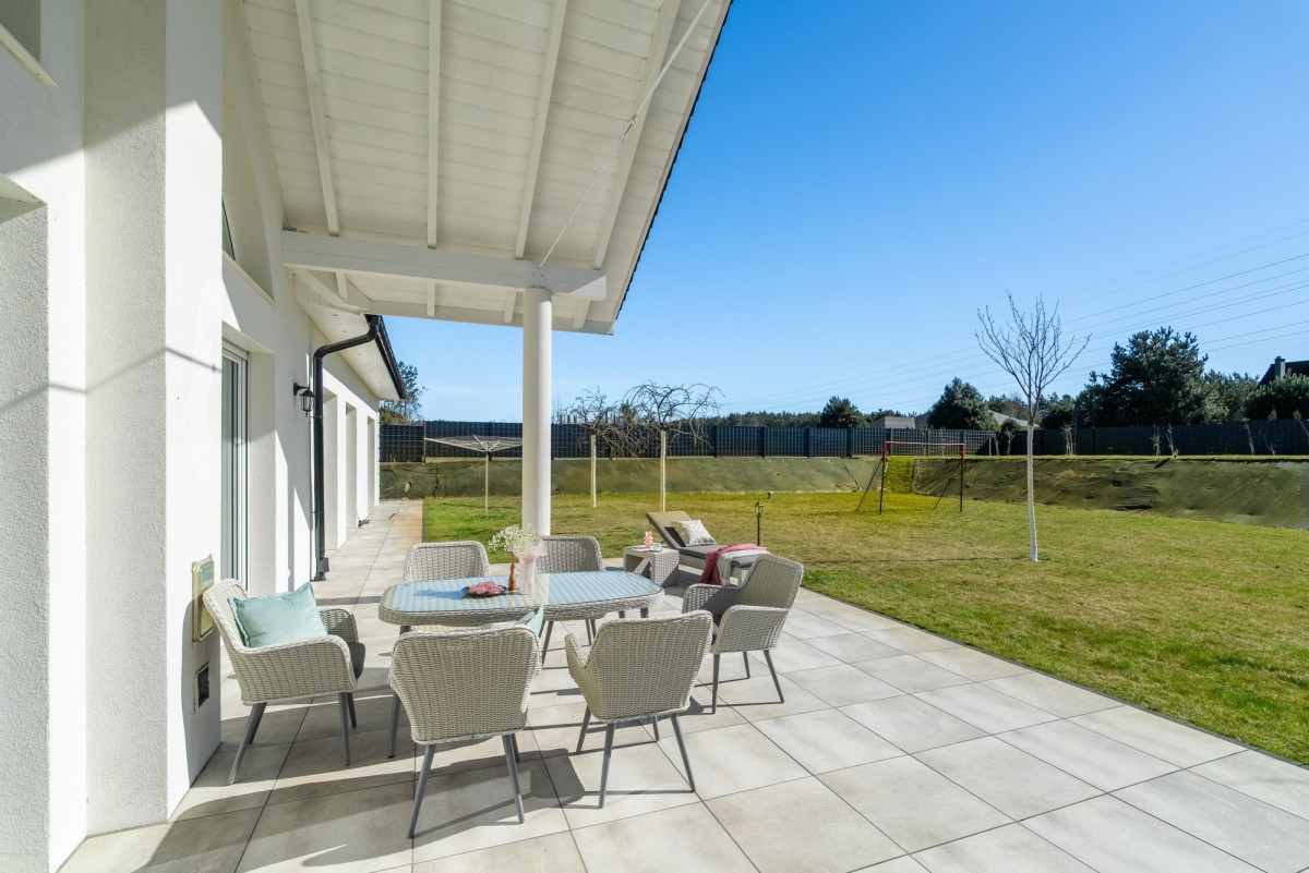 * Taras z wyjściem z każdego pokoju na parterze, co podnosi komfort codziennego życia i wygodnie łączy wnętrze domu z ogrodem.