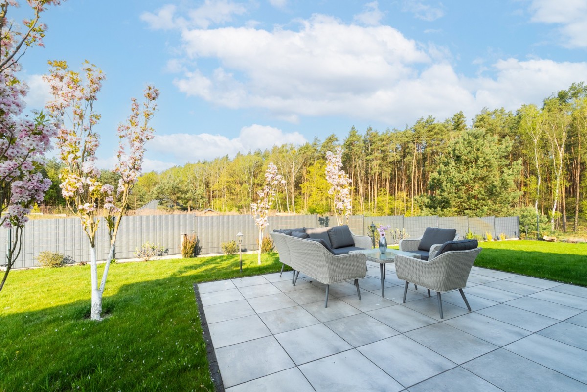 Automatyczne nawodnienie i robot koszący taras ułatwiają utrzymanie ogrodu w bardzo dobrej kondycji. Widok na las i bardzo cicha okolica dają możliwość stworzenia prywatnej strefy do odpoczynku i relaksu.